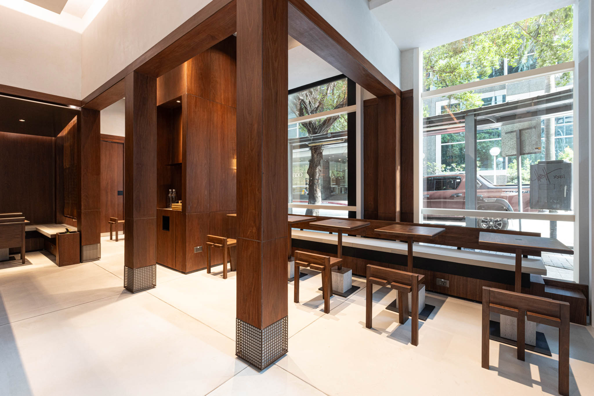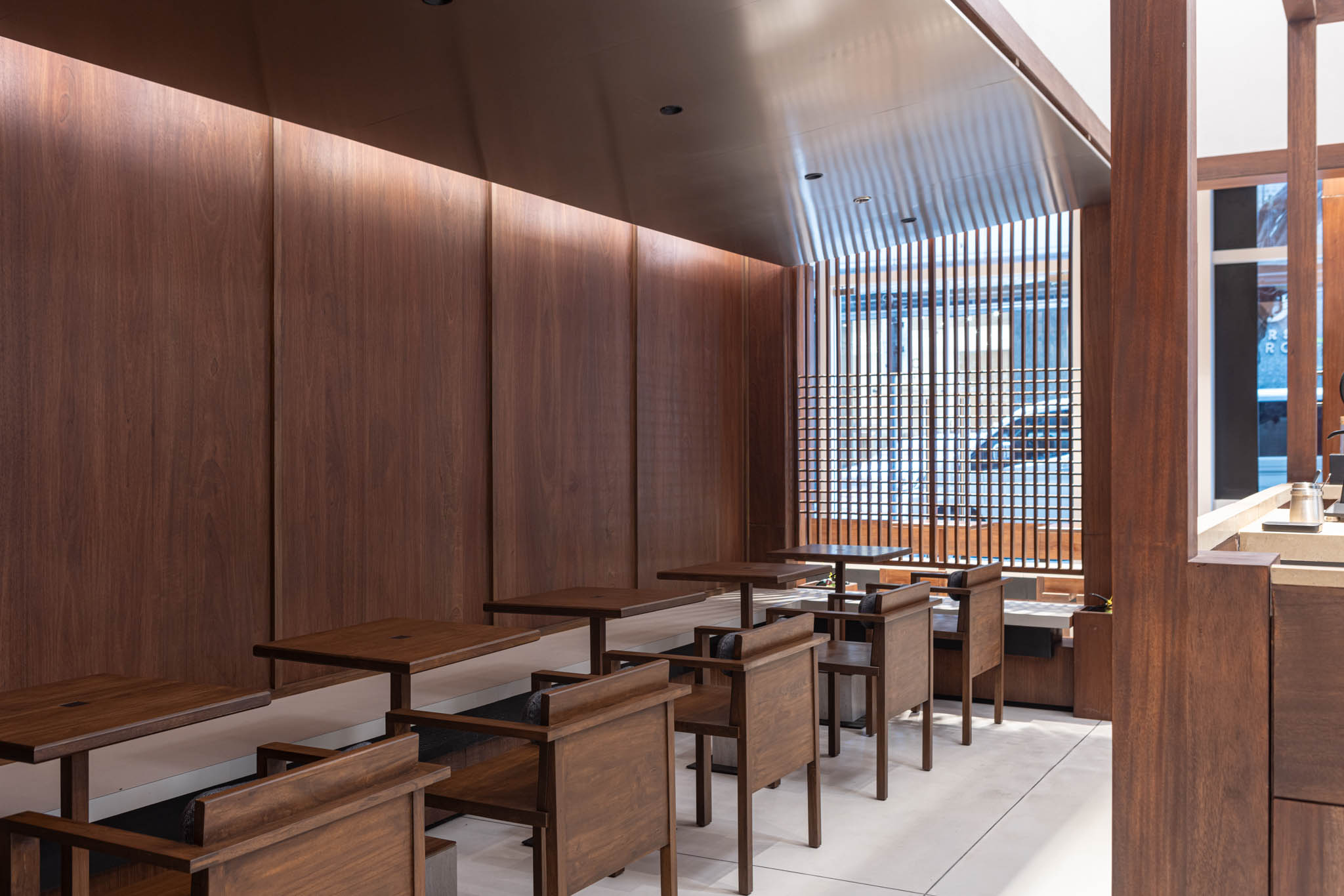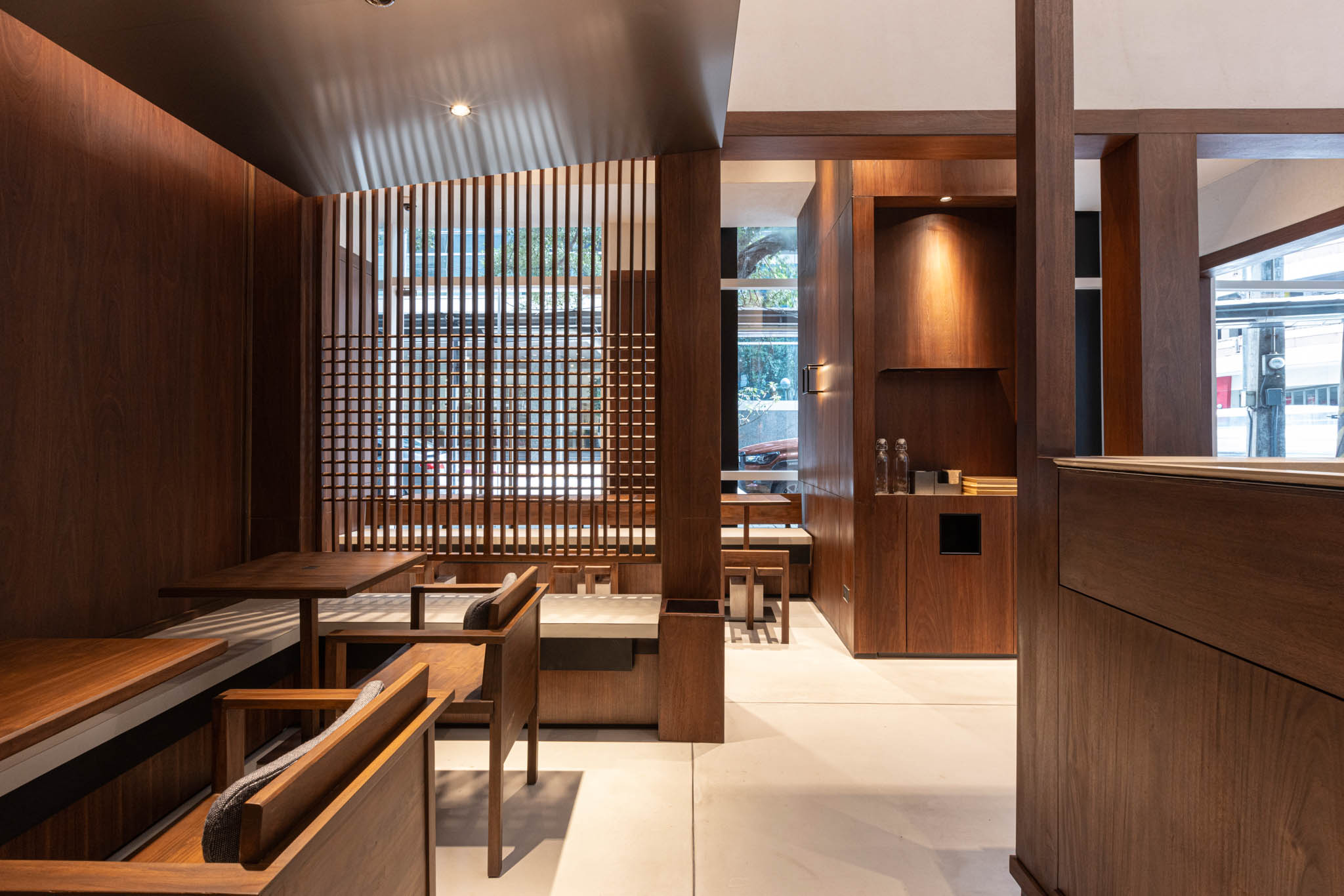 Towards the back, a snug lounge area is defined by lattice partitions and features chairs upholstered with Kvadrat textile. A slanted stainless steel ceiling adds an airy element to this space. The geometric cube motif, a brand hallmark seen in the kiosk and their kashi (baked custard), subtly appears in column bases, kitchen windows, and even the rubbish chute.