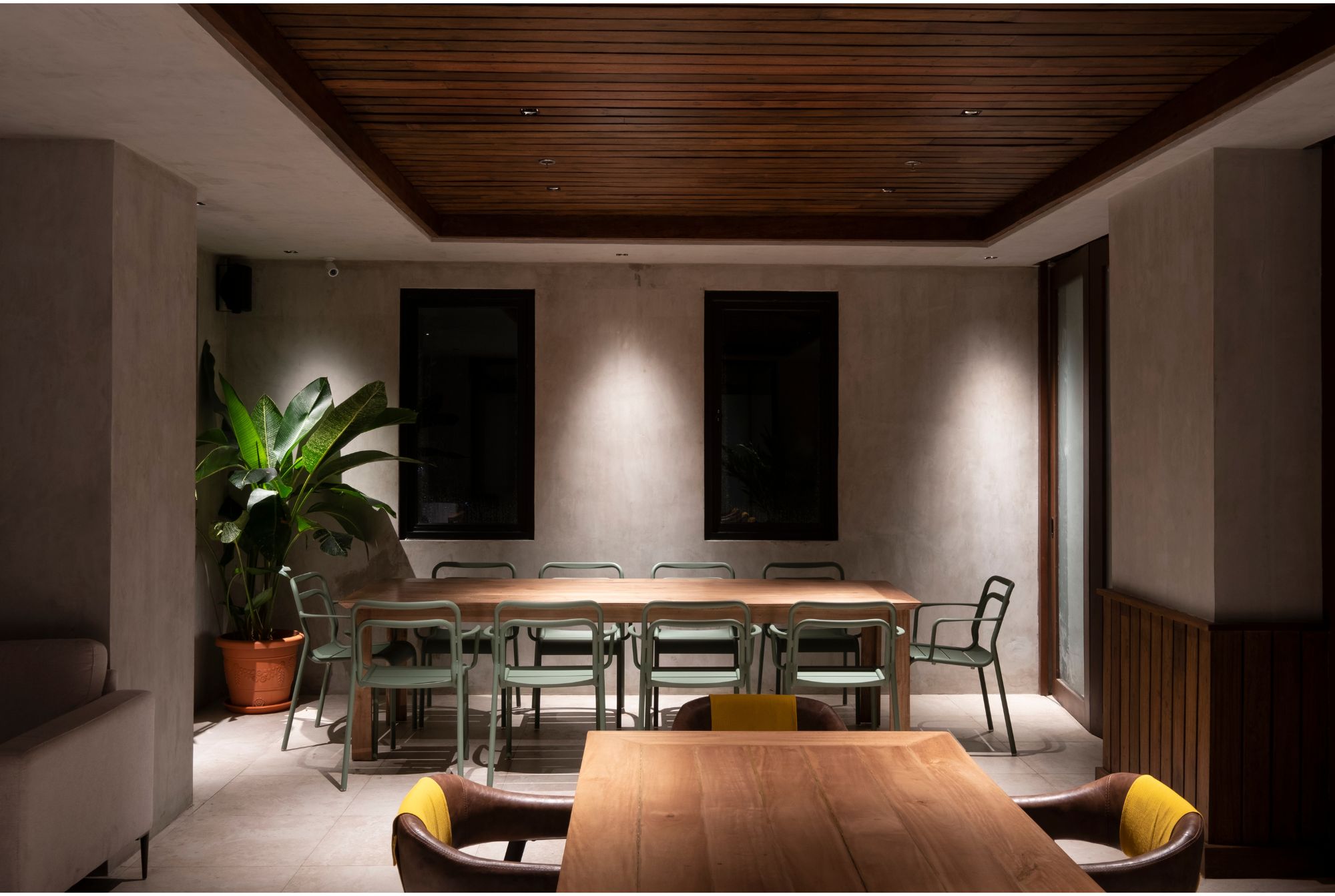 Key architectural features include custom laser-cut panels with the cafe’s logo that divide spaces and screen walls that create a play of light and shadow. The second floor’s ceiling showcases curved concrete beams with wooden trim. Unique niches like the rustic-elegant wine cellar and the luxurious, wood-paneled cigar room add distinct character. Outdoor seating and a roof deck provide additional space.