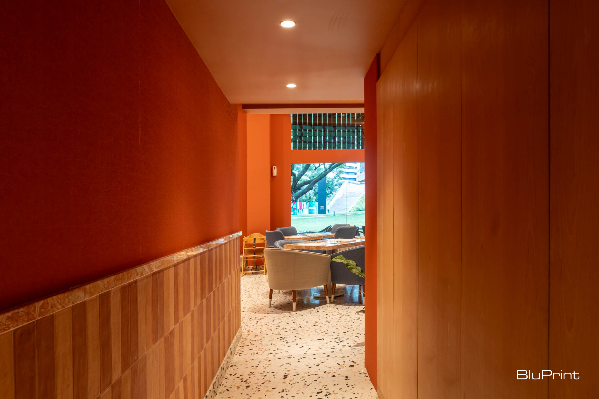 Spanning almost 200 square meters and accommodating up to 70 guests, Kazu Cafe offers various seating options. This includes al fresco dining, a private room, and semi-circular booth seating for a sense of privacy. Even the bathrooms reflect the playful design with unique flooring and mirrors.