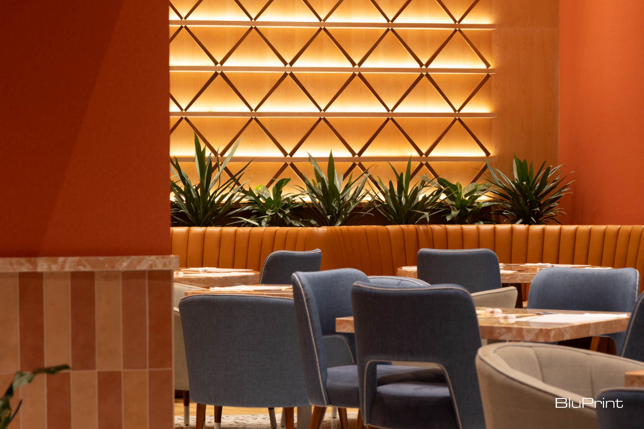 The cafe interior design features thoughtful and interactive elements, such as chopstick-inspired wall decor, denim upholstery, terrazzo flooring, and marble accents. Aside from creating a balance between rustic and polished styles, Wes Anderson’s whimsical aesthetic further shapes the coffee shop design’s distinctive character. Sculptural lighting and a constantly changing LED art wall also provide visual interest, while strategically placed greenery adds warmth.