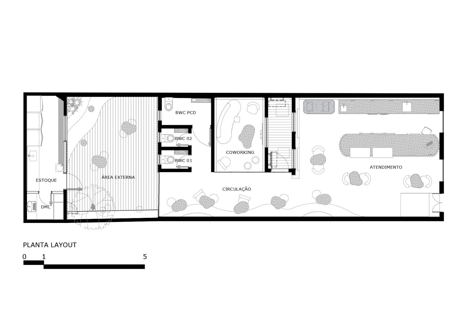 Since it is a coffee shop and coworking space, the project’s design focuses on the functionality necessary for activities to be carried out quickly within the space. The studio proposed a clean aesthetic for the environment which resulted in a contemplative, calm space without many visual interferences. This allowed the studio to develop some of the furniture present inside the space, including the tables, chairs, and other elements.