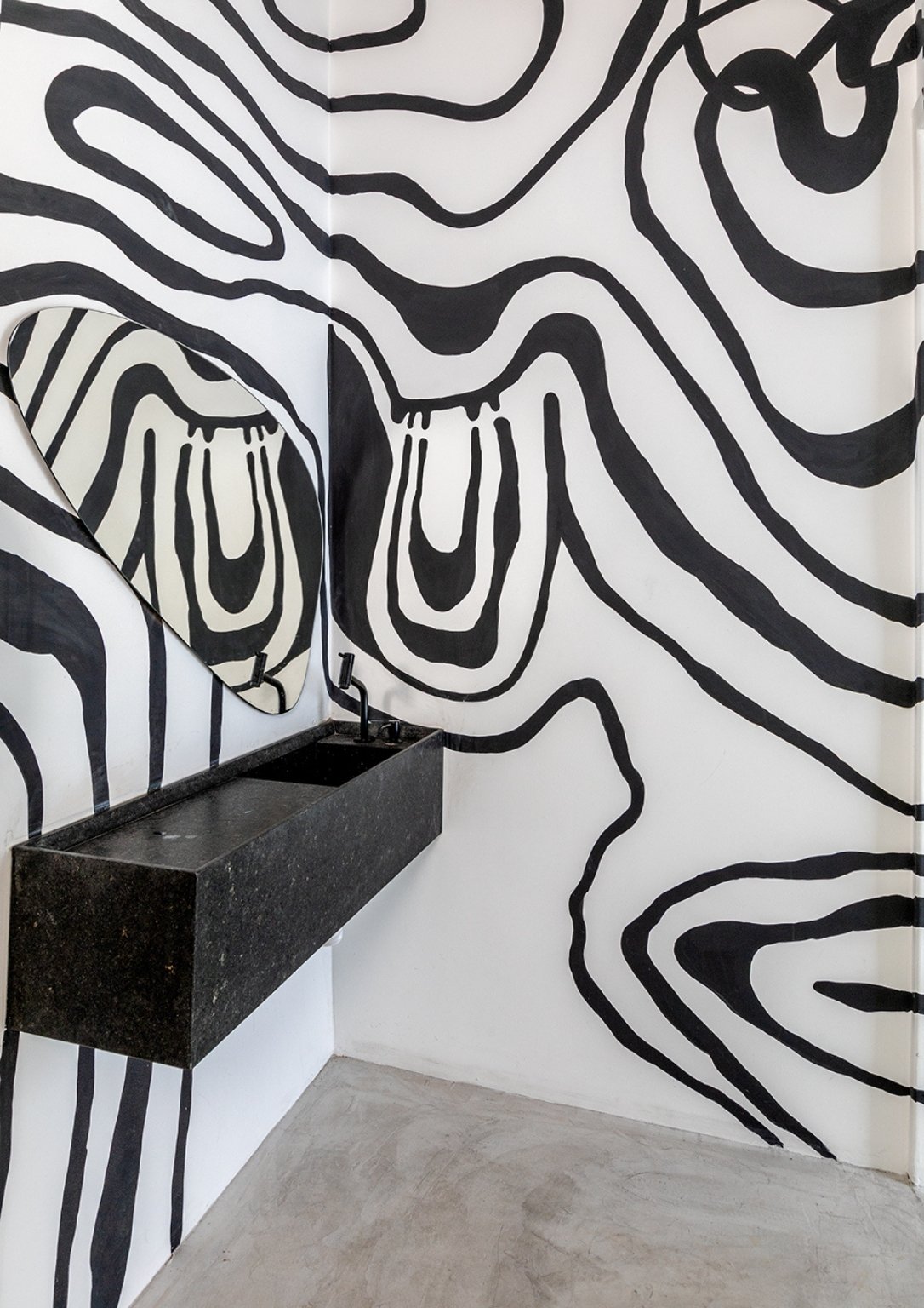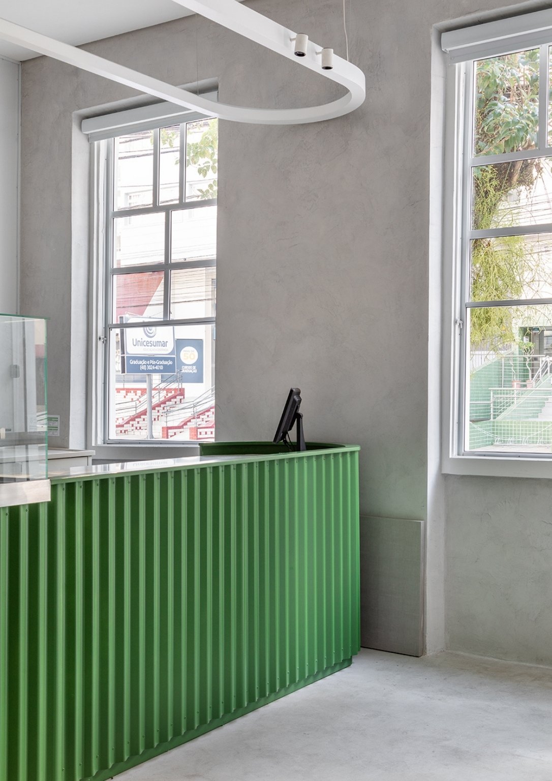 The studio also designed the call center furniture and covered it with tile. They used a not-so-conventional material to bring a greater personality to the space. The floors and walls, meanwhile, create a neutral background for the project with their cementitious material coating. The matcha shop’s bathroom offers a surprise to anyone who uses it with the elements of escapism incorporated into it. The studio also used the tiles in the external area of the shop to create a rhythmic background.