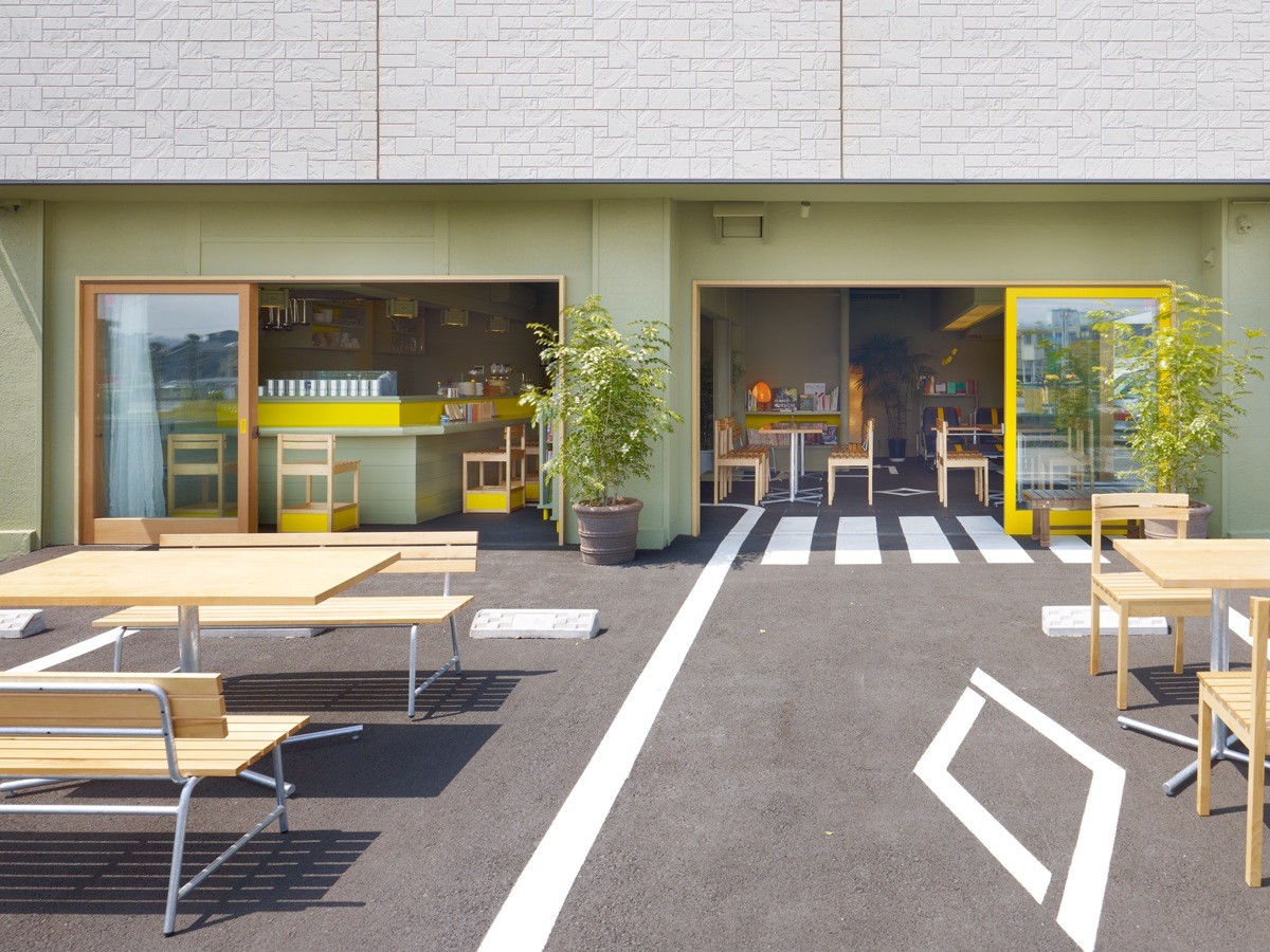 The cafe continues the theme of creative repurposing with its furniture. It’s an assembly of references to the roads of Japan, whether it be from the perspective of car users, commuters, or pedestrians. Repurposed car seats are a nod to the area’s automotive history. Bus stop-inspired benches allude to the public amenities. The cafe’s character simulates the neighborhood’s past and present by taking in these everyday objects and refurbishing them in a different context.