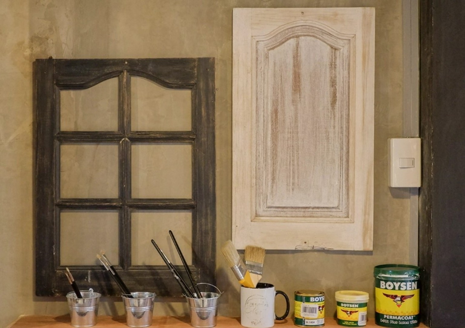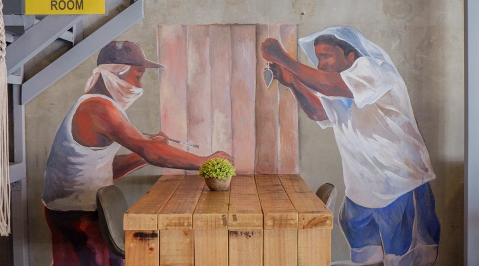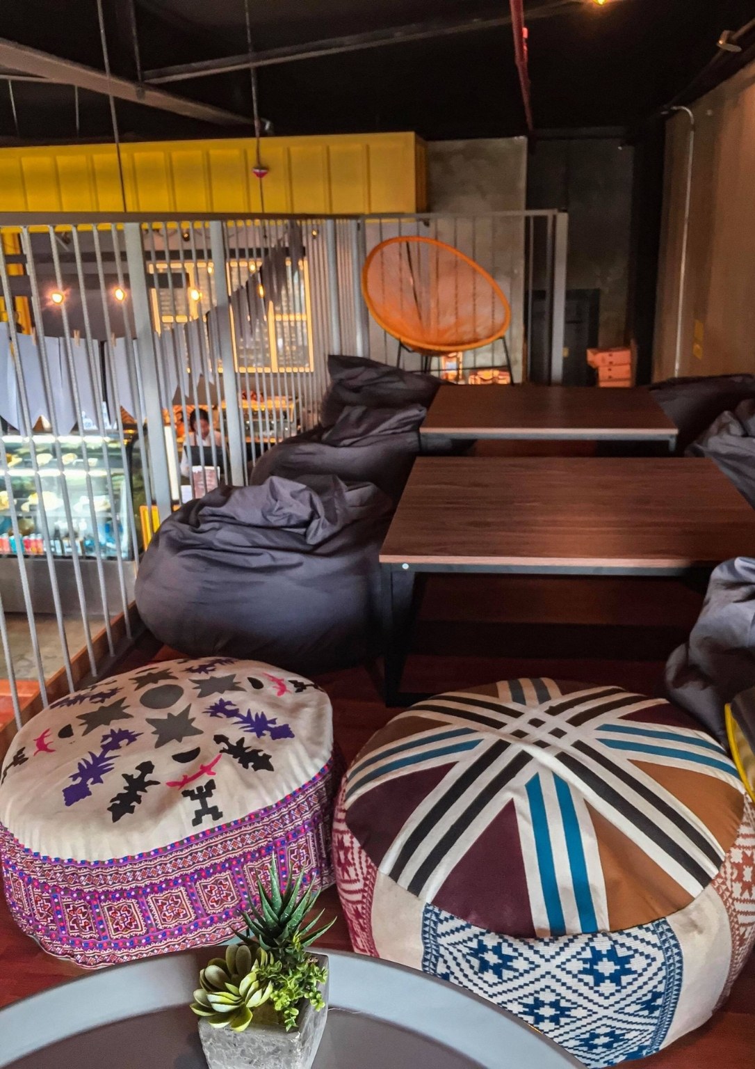 Excellent use of mezzanine design is also present in the café to maximize their seating capacity. At the lower part of the mezzanine is the mural depicting two workers painting wood. It complements the hanging pieces of wooden windows that serve as a wall accent. Some of the lead ledges feature designs with buckets and paintbrushes. The upper mezzanine uses pouf seating made by local Filipino weavers. The café counter is made of wooden crates and yellow ribbed-type G.I. sheets as materials. Making it more interesting is the glass window-like accent above the counter that serves as a menu board.