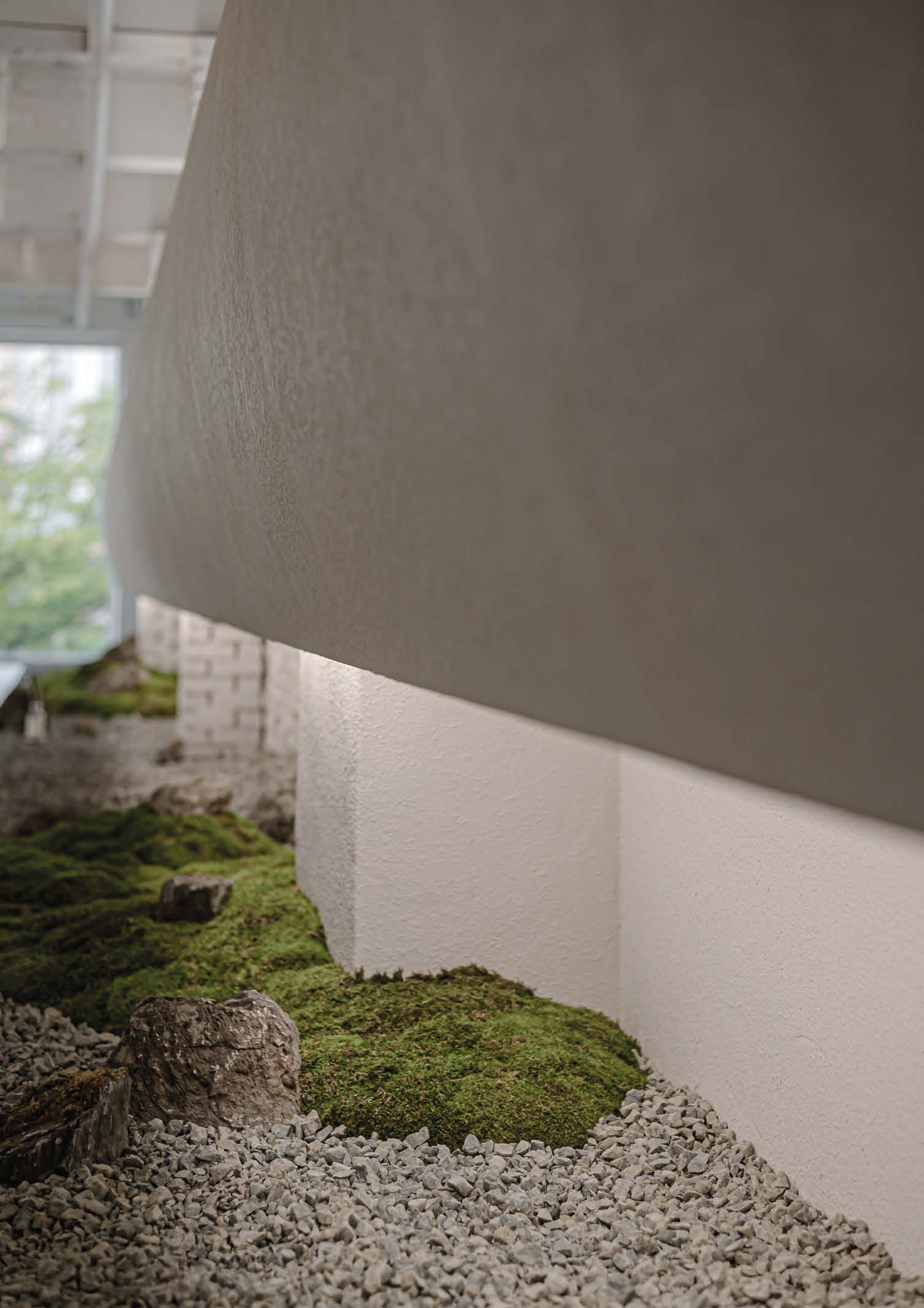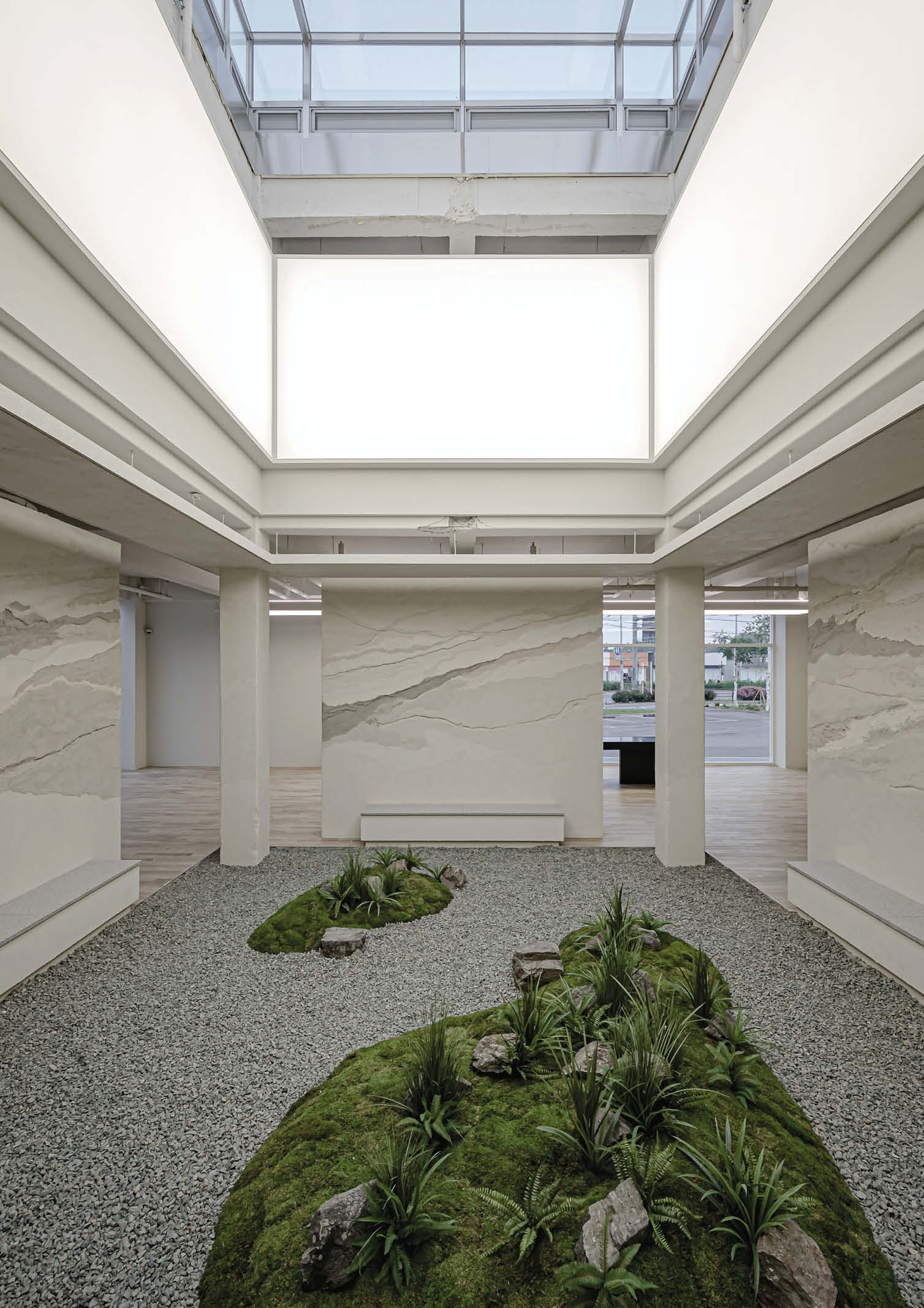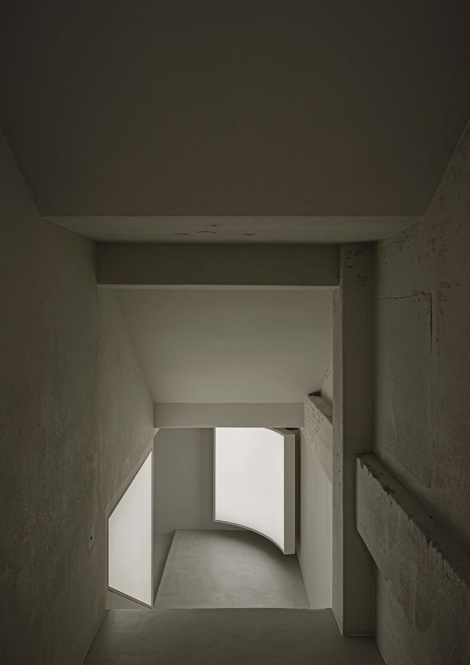 Lastly, the massive wall in the center of the first and second floors is opened through the ceiling and extremely restricts other elements of the interior. The architect explains that the light and scenery filled in through the ceiling change depending on the seasons and weather which creates an unpredictable sensory experience for visitors.