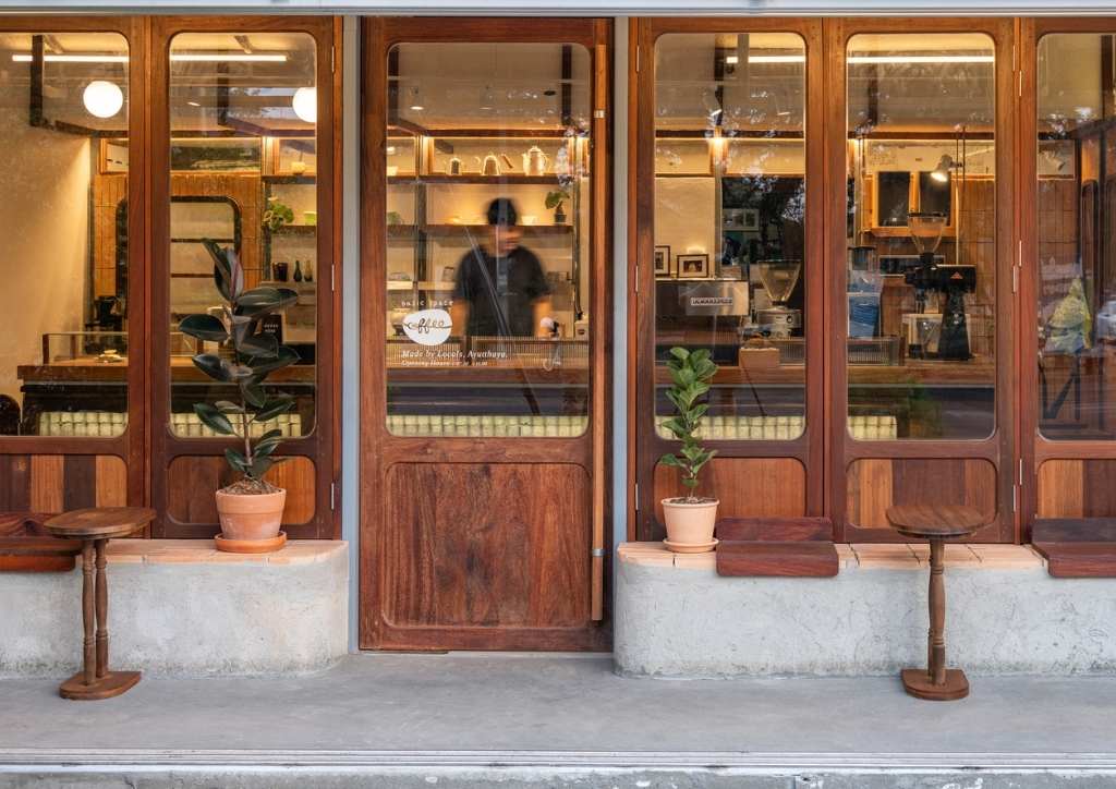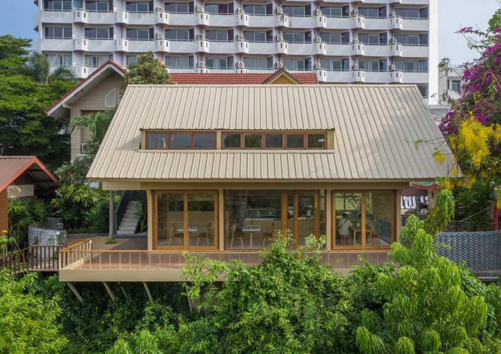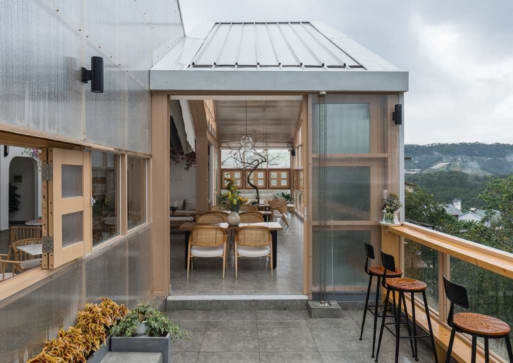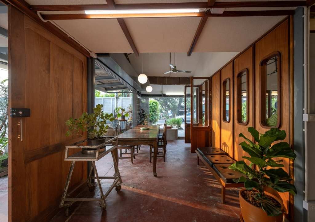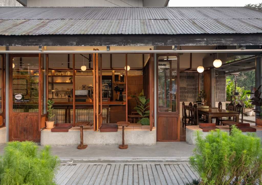 The cafe is also surrounded by wooden doors and big windows which serve as accents for both the indoor and outdoor seating areas. The ingeniously designed windows can also be opened to create divisions between the outdoor seats. More traditional furniture in the outdoor seating area connect the coffee shop to the kitchen area and the rest of the property.