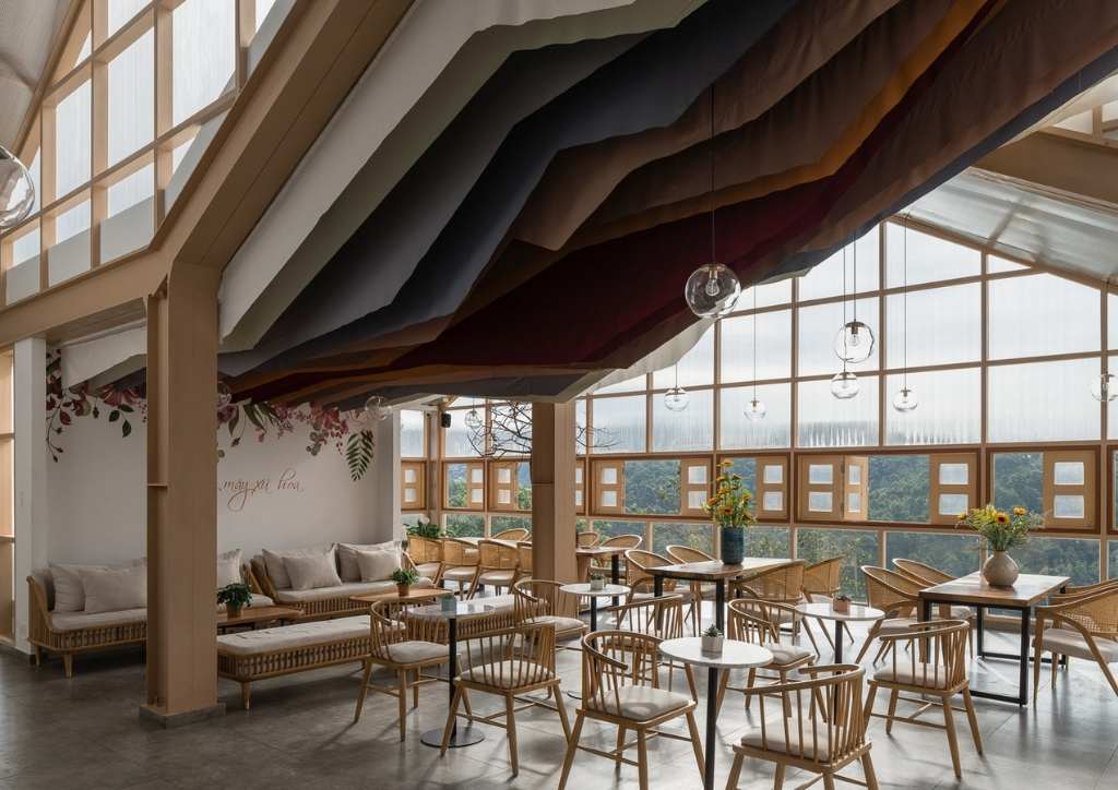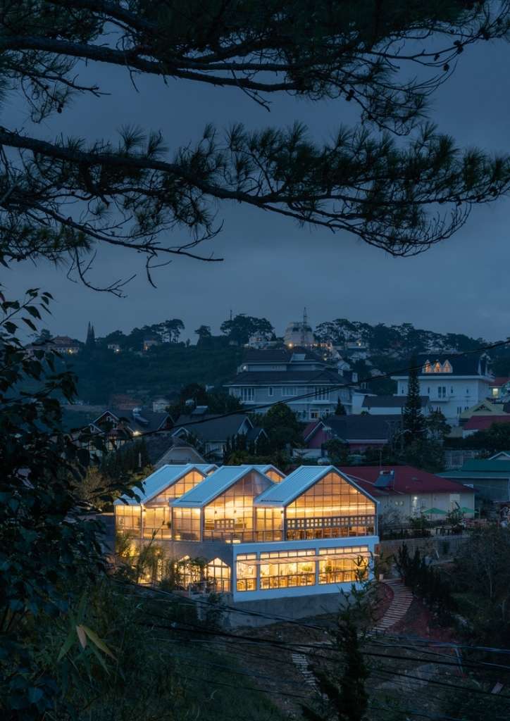 “Putting aside the impacts of those greenhouses to the environment, we wanted to reproduce the images of them lit up in the night, draw many visitors to Da Lat,” the architects added. “That’s why polycarbonate was chosen to envelope the building. This material, combined with glass where necessary to prioritize the view of the landscape, create the effect of a ‘lit up greenhouse’ at night.”