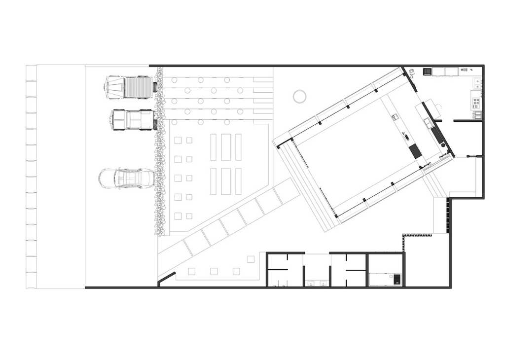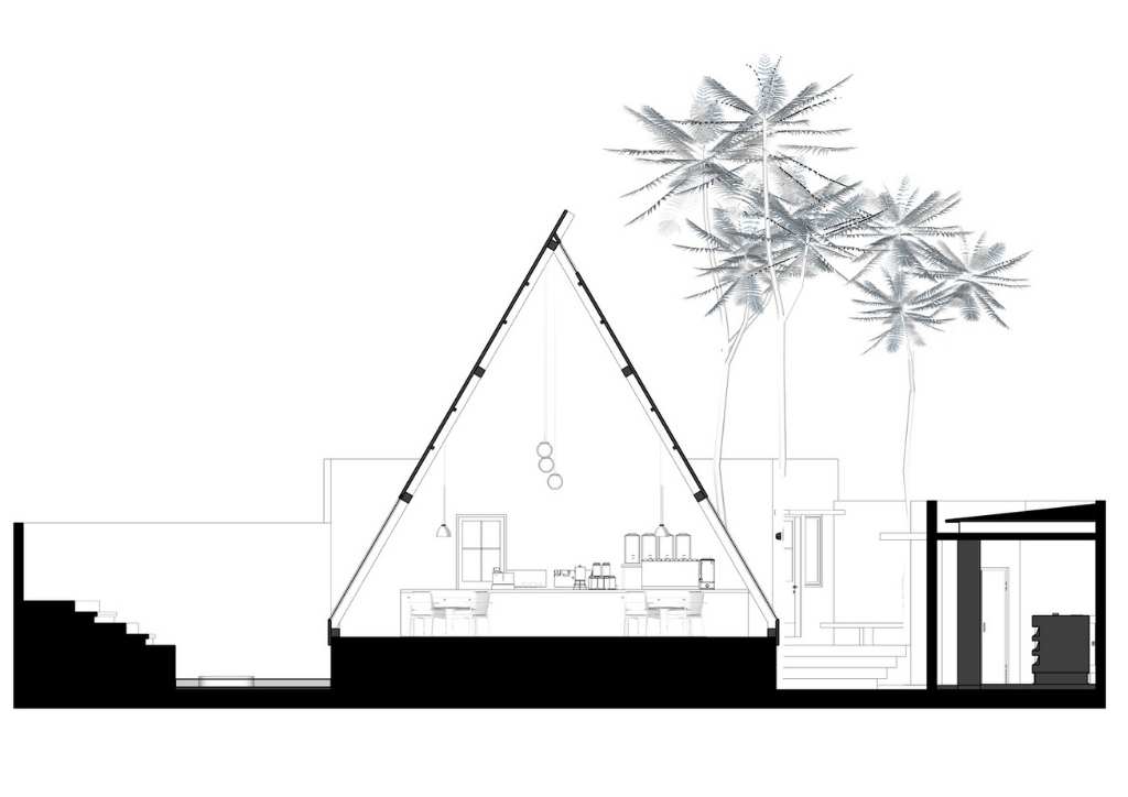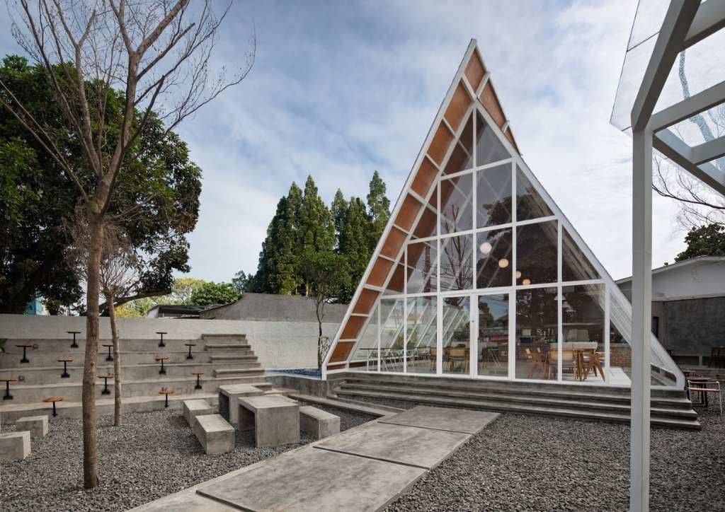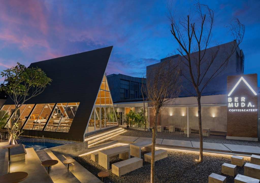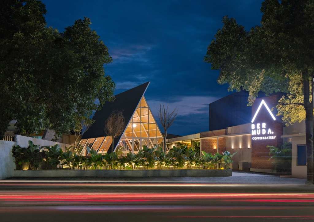 Inspired by the brand identity of Segitiga Bermuda Coffee and Eatery, STUDIE had the bright idea to design a triangular building that stands out from its location. To achieve this, they oriented the main structure 45 degrees sideways from the main road. This created a striking three-dimensional effect that certainly catches the attention of passers-by.
