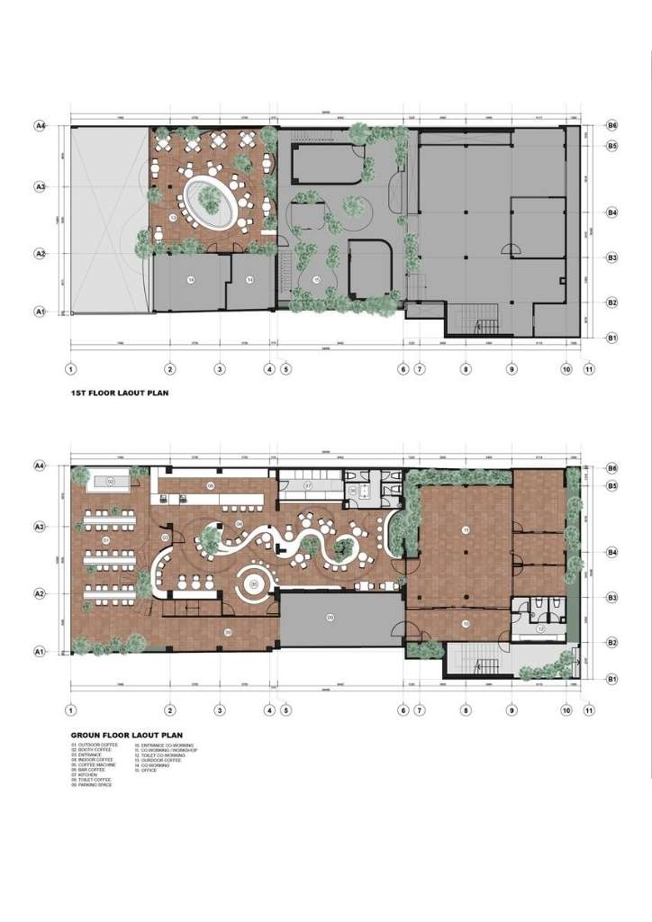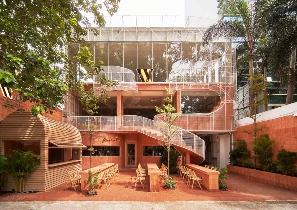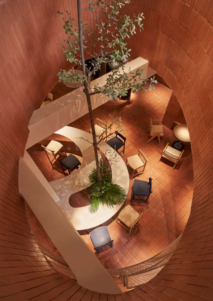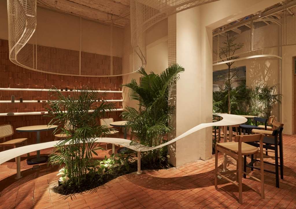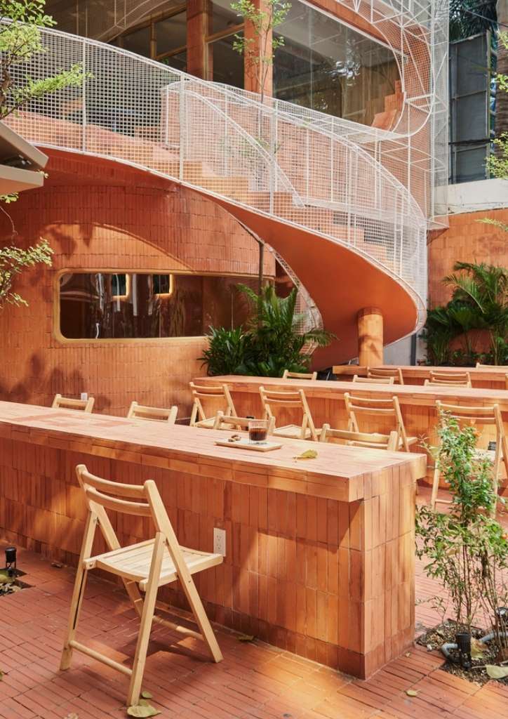 The current property was actually built from an old building. The designers connected some of the existing columns with a large, curved common table strip that spans across the entire space of the first floor. A mini indoor garden also punctuates this structure, adding splashes of green against the white and terracotta red interiors. The brick design is also seamlessly integrated in the generous outdoor seating of the coffee shop.