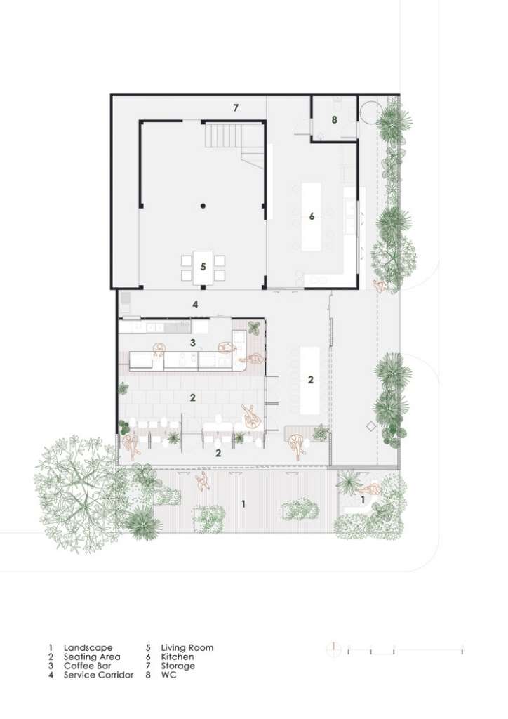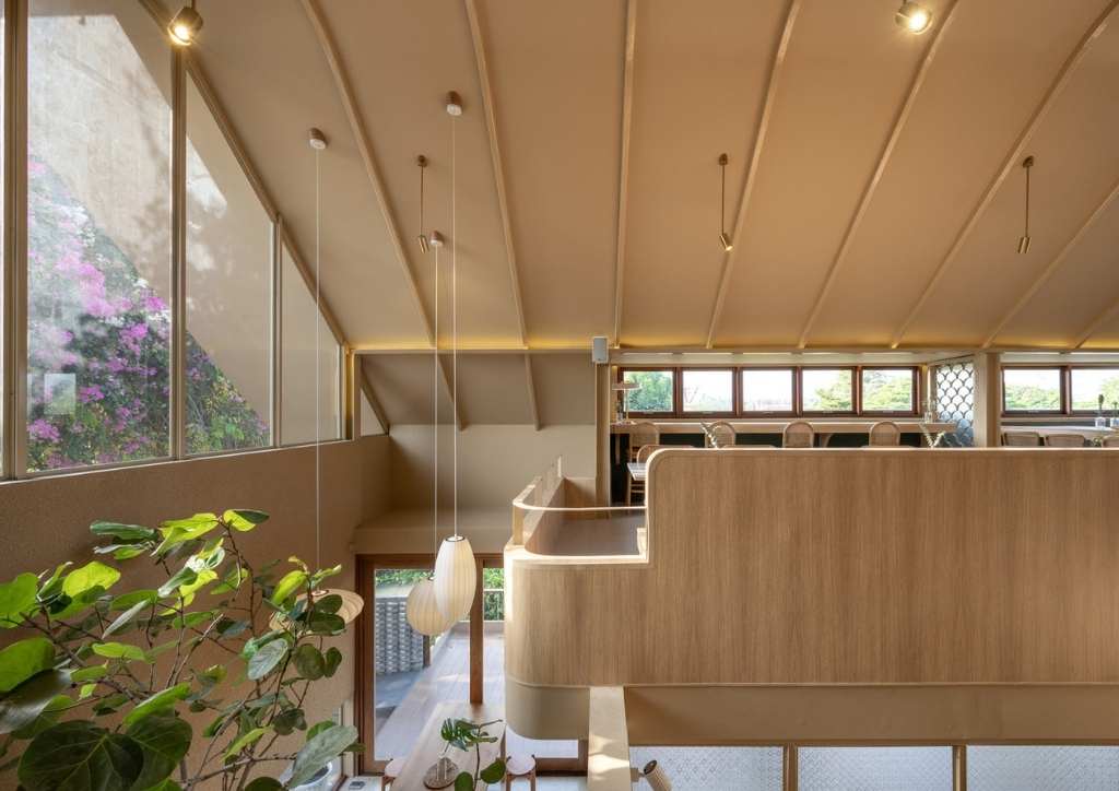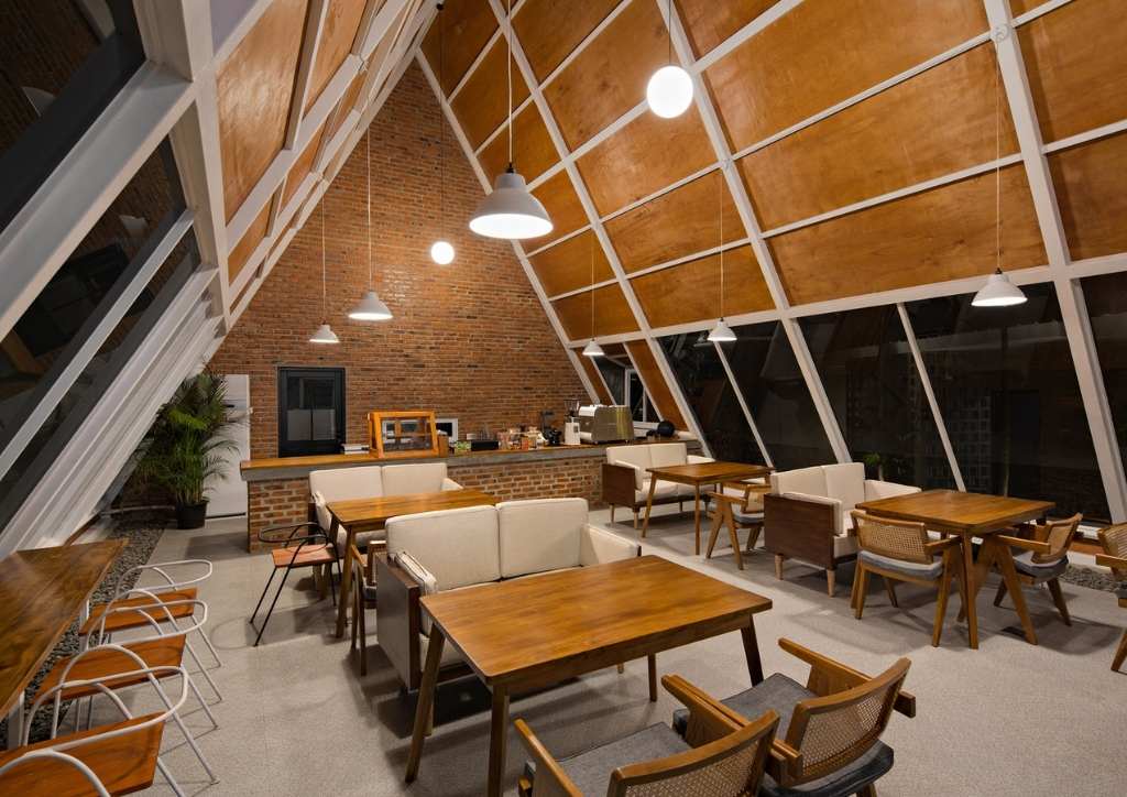 The first floor houses the heart of the entire property, showcasing the cafe counter where the drinks are made. Access to the second floor is through the outside staircase. This not only eases the foot traffic in the first floor, but also provides privacy to the diners in the area. Other modern touches include big glass windows and panels, sloped ceiling, indoor gardens, and elegant wooden interiors.
