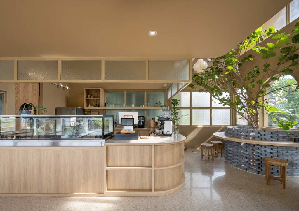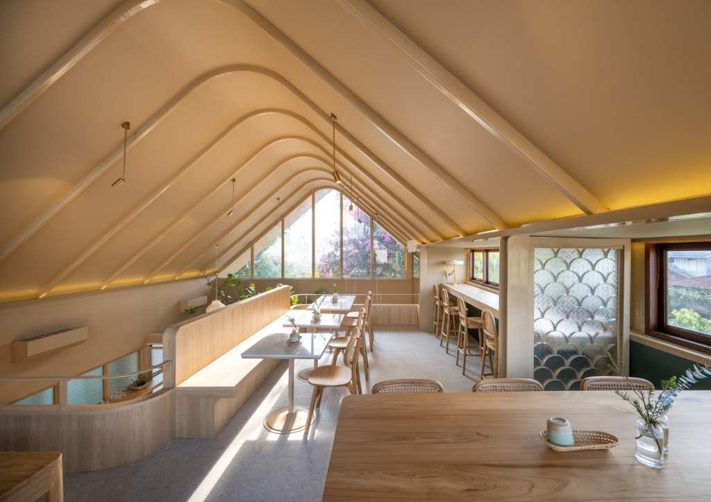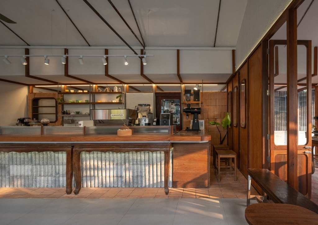 To maintain the traditional look, they preserved much of the building’s exterior, particularly the roof trusses and other materials. They focused the modern touch in the interior space, starting with replacing the flat ceiling into a sloped one that follows the gable roof. This extra vertical dimension gave the shop area a more airy atmosphere. The owner wanted to keep some memorable furniture pieces. These include table sets and the Kha-sing wooden table that was seamlessly repurposed as the coffee bar.