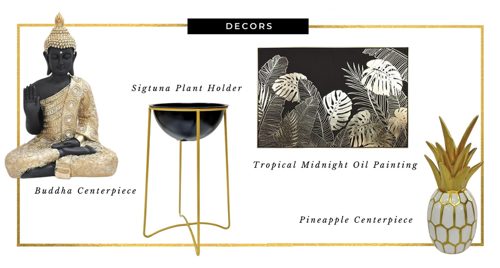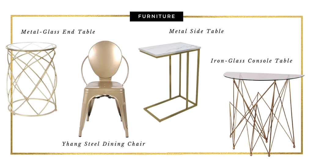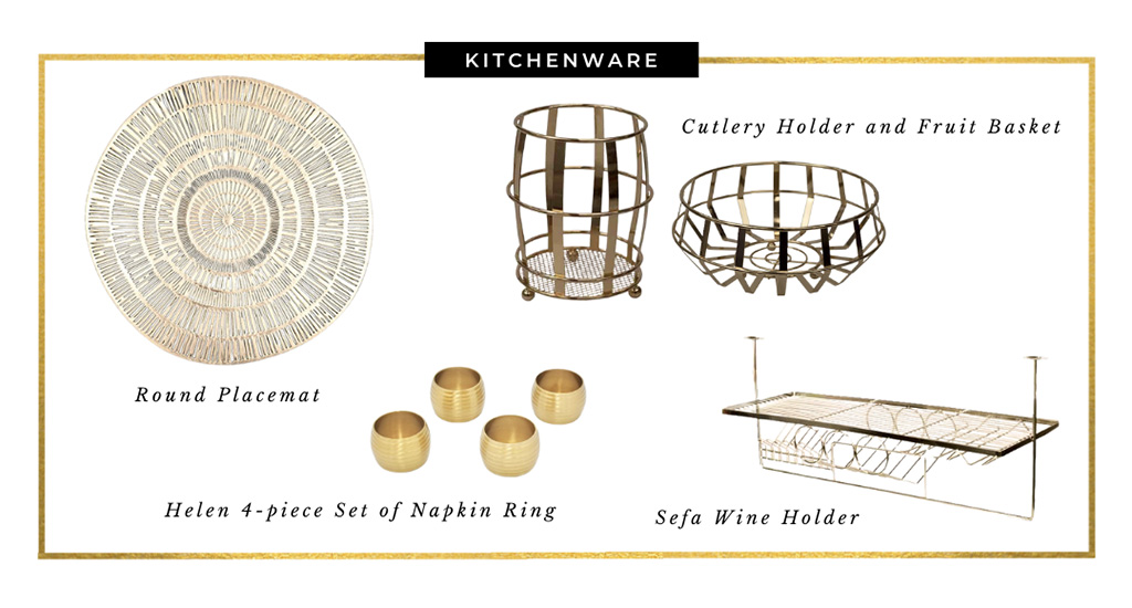 Adding the visual of gold into your home can also be achieved in relatively more subtle ways. One option to incorporate gold in your houseware may be achieved through a multitude of centerpieces, plates, placemats, and other home essentials. These additions leave a soft yet exquisite touch in the overall aesthetic of your space. A refined selection of houseware for your dining set with gold finishes can be found from Heim, while Homebasics and Sefa offer an assortment of kitchen organizing essentials presenting a gold finish to complement any interior philosophy.