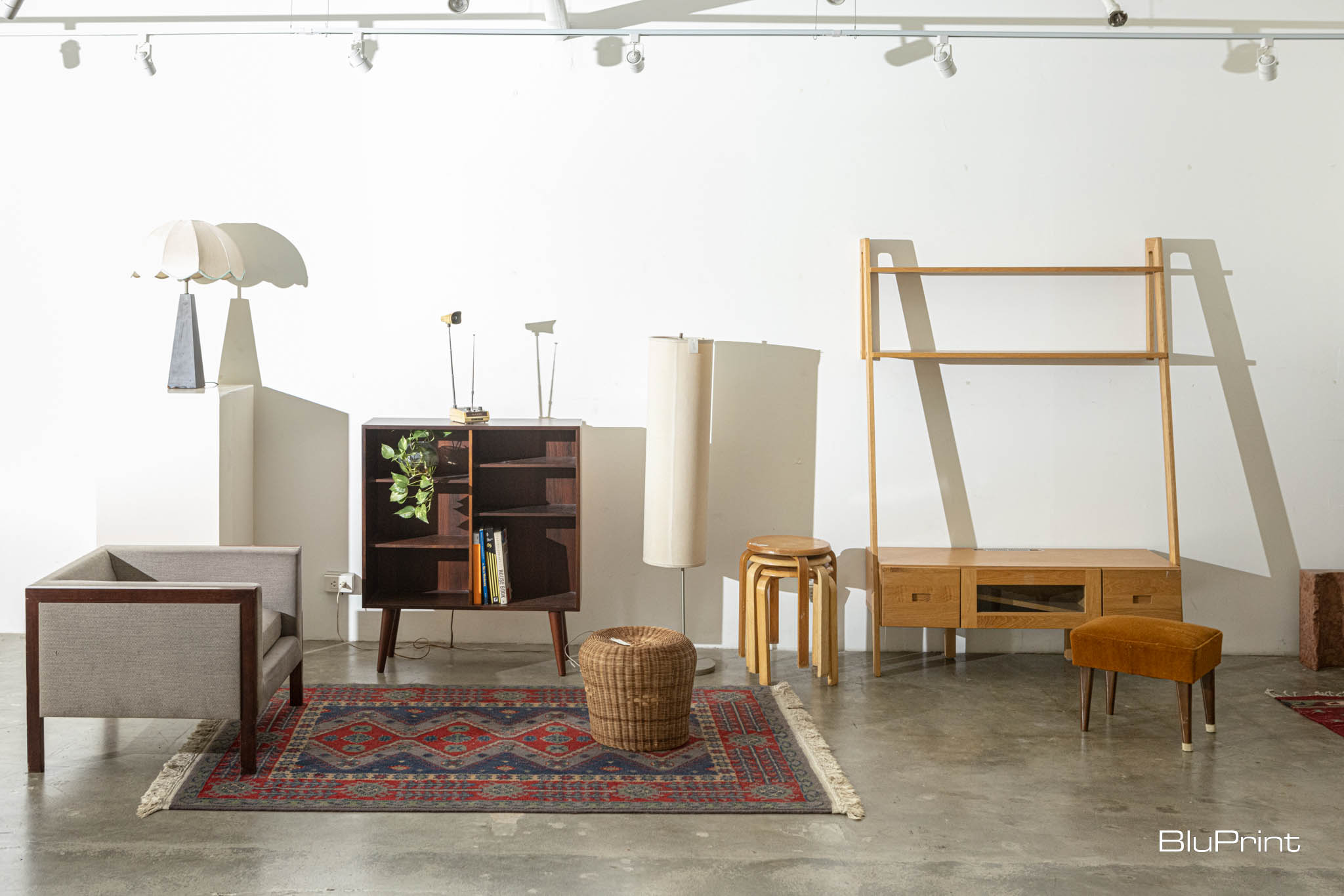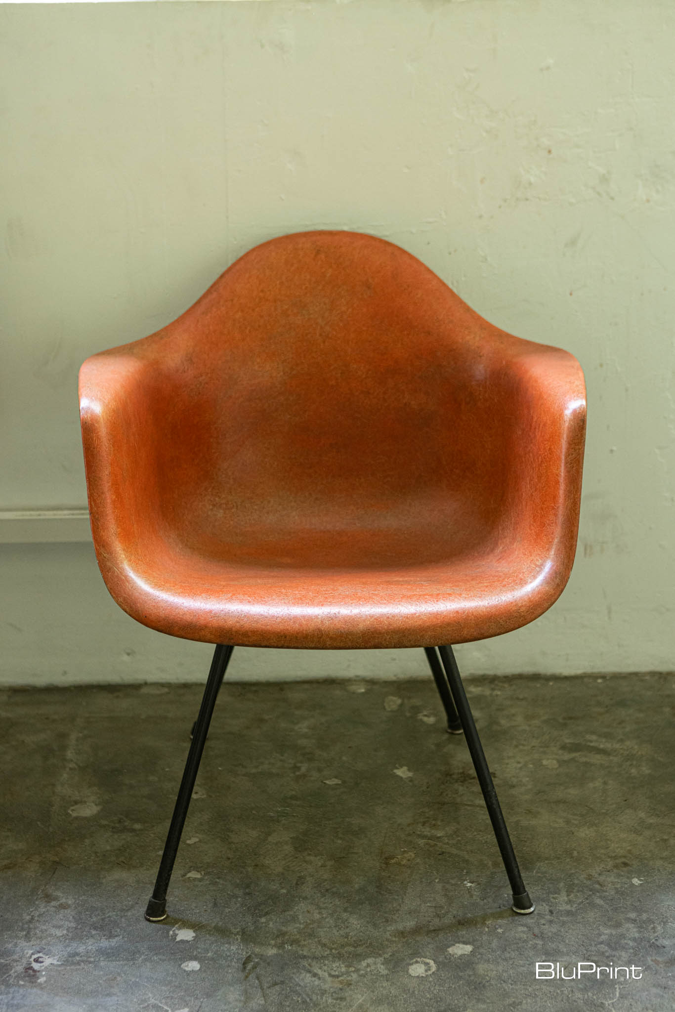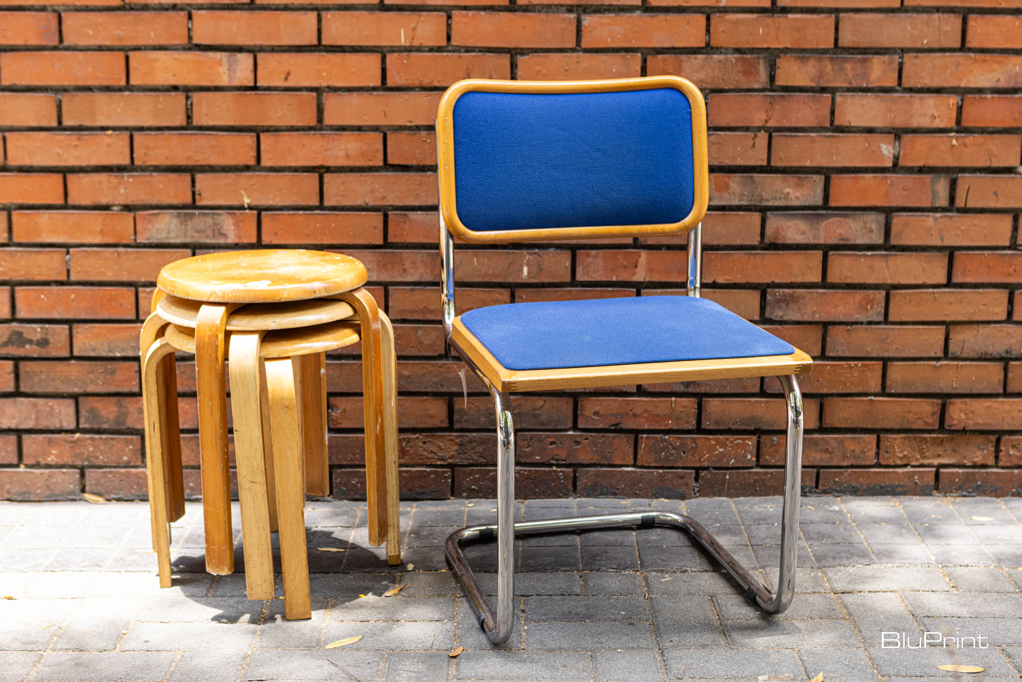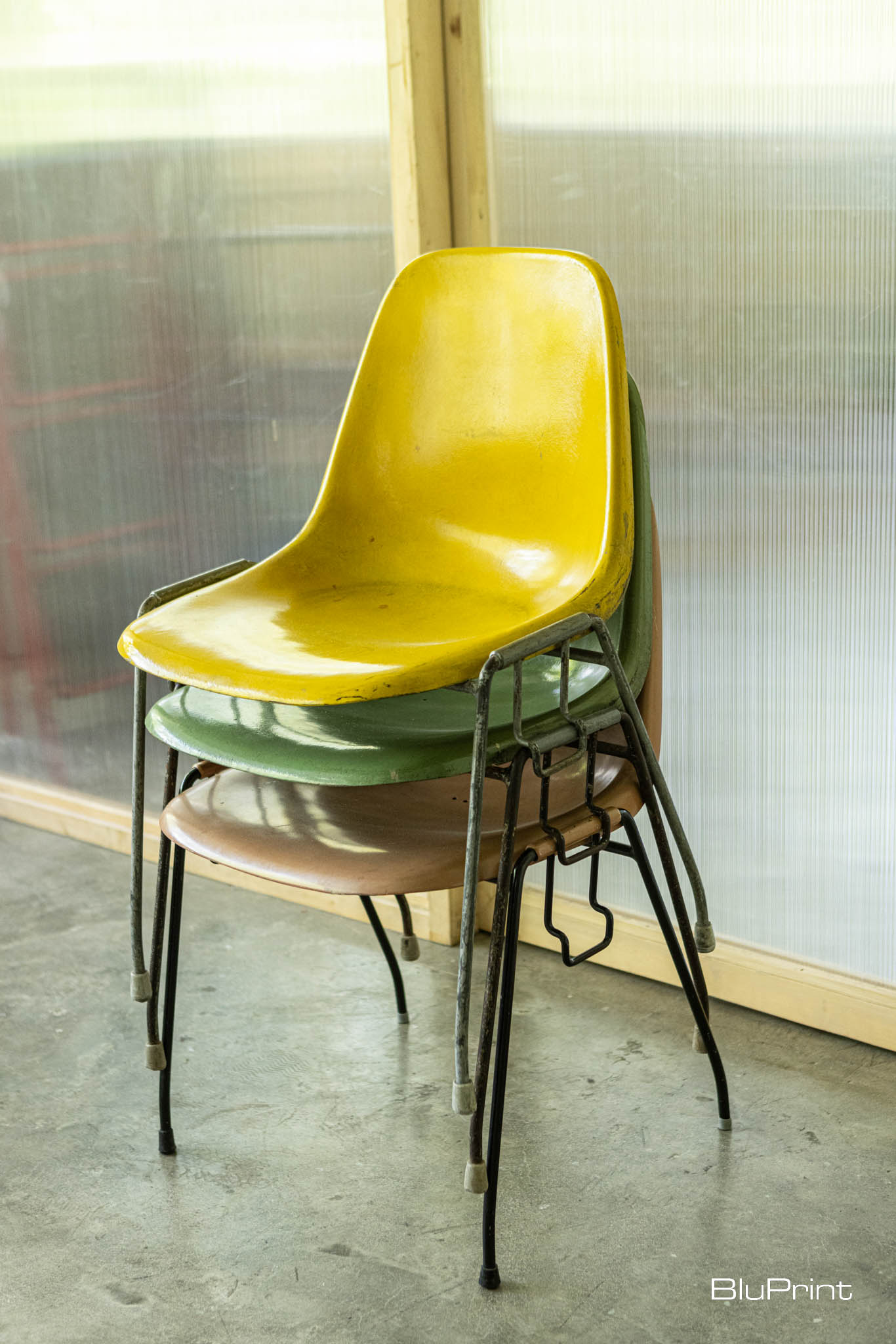 A vintage chair with an burnt orange shell is designed to perfectly hug your body’s curves. There’s a stack of Stool 60 chairs designed by Alvar Aalto by the far wall. Their legs may have noticeable scratches, but it only proves they were used well.