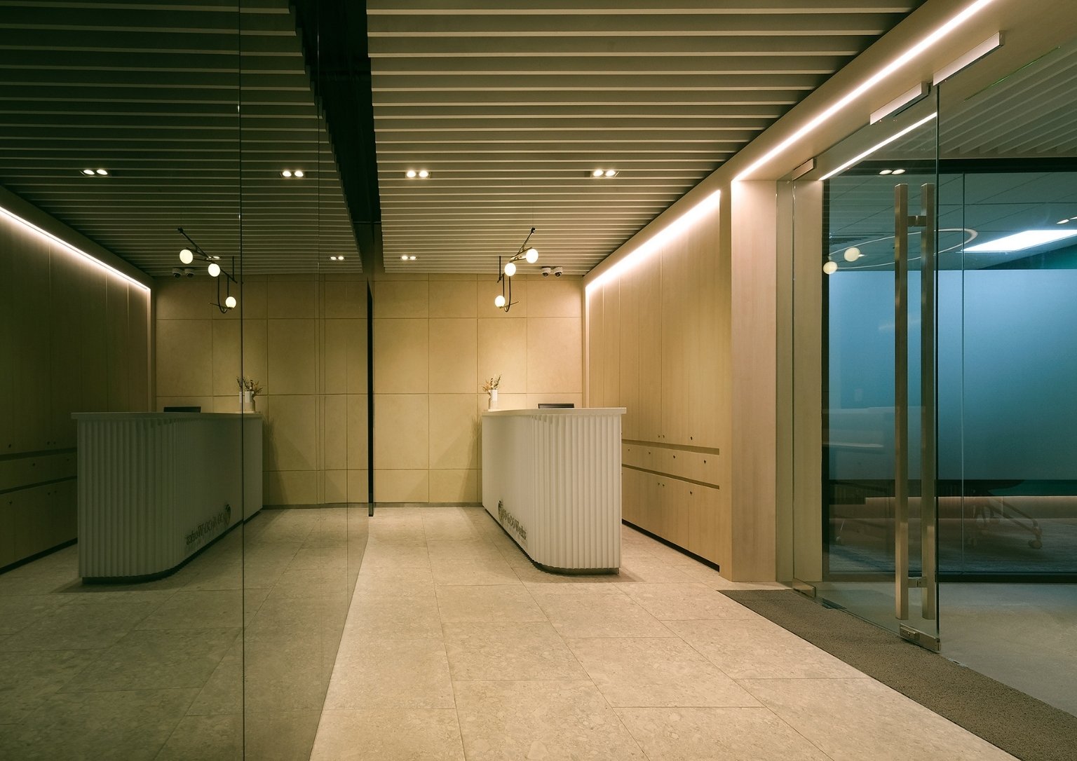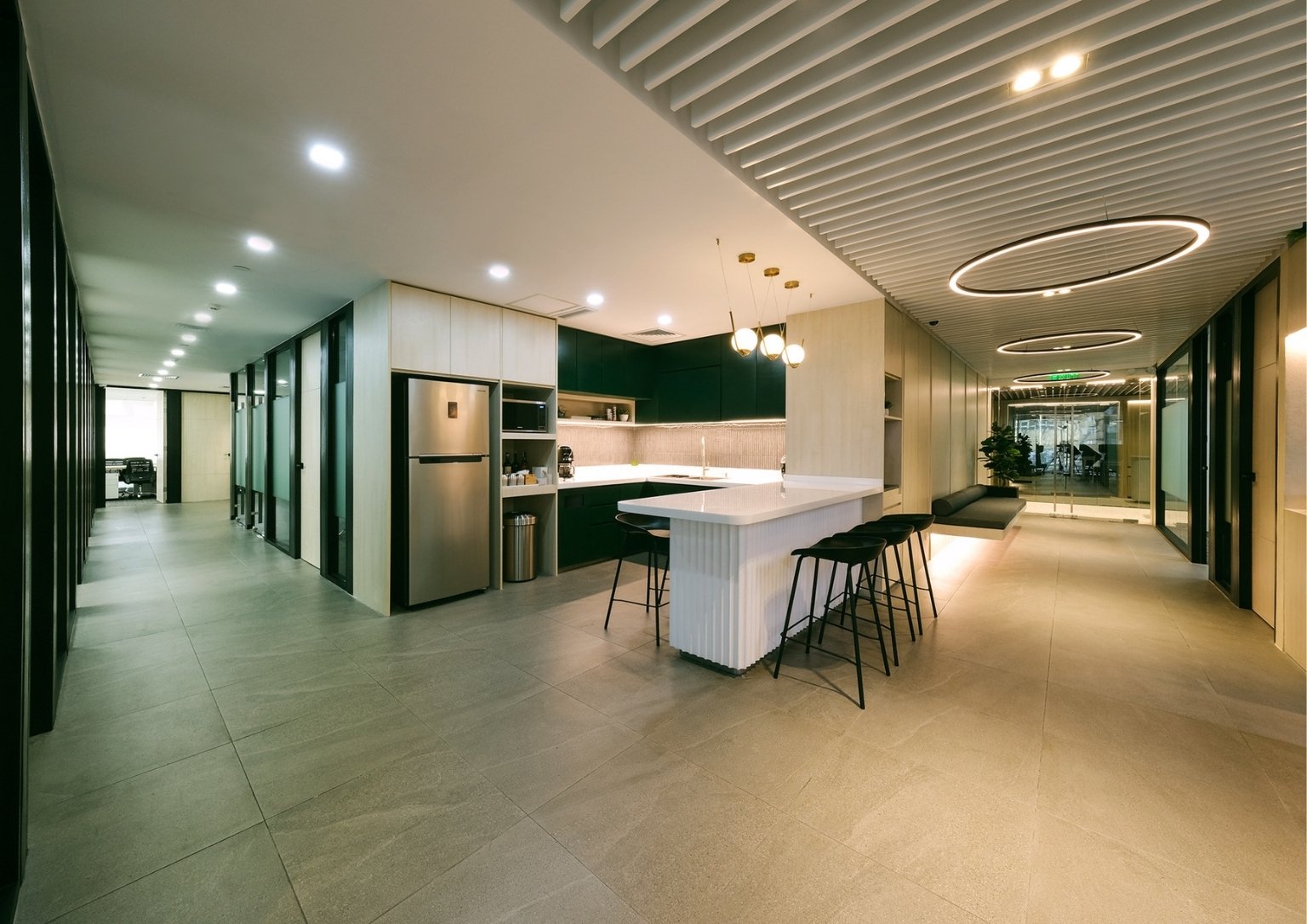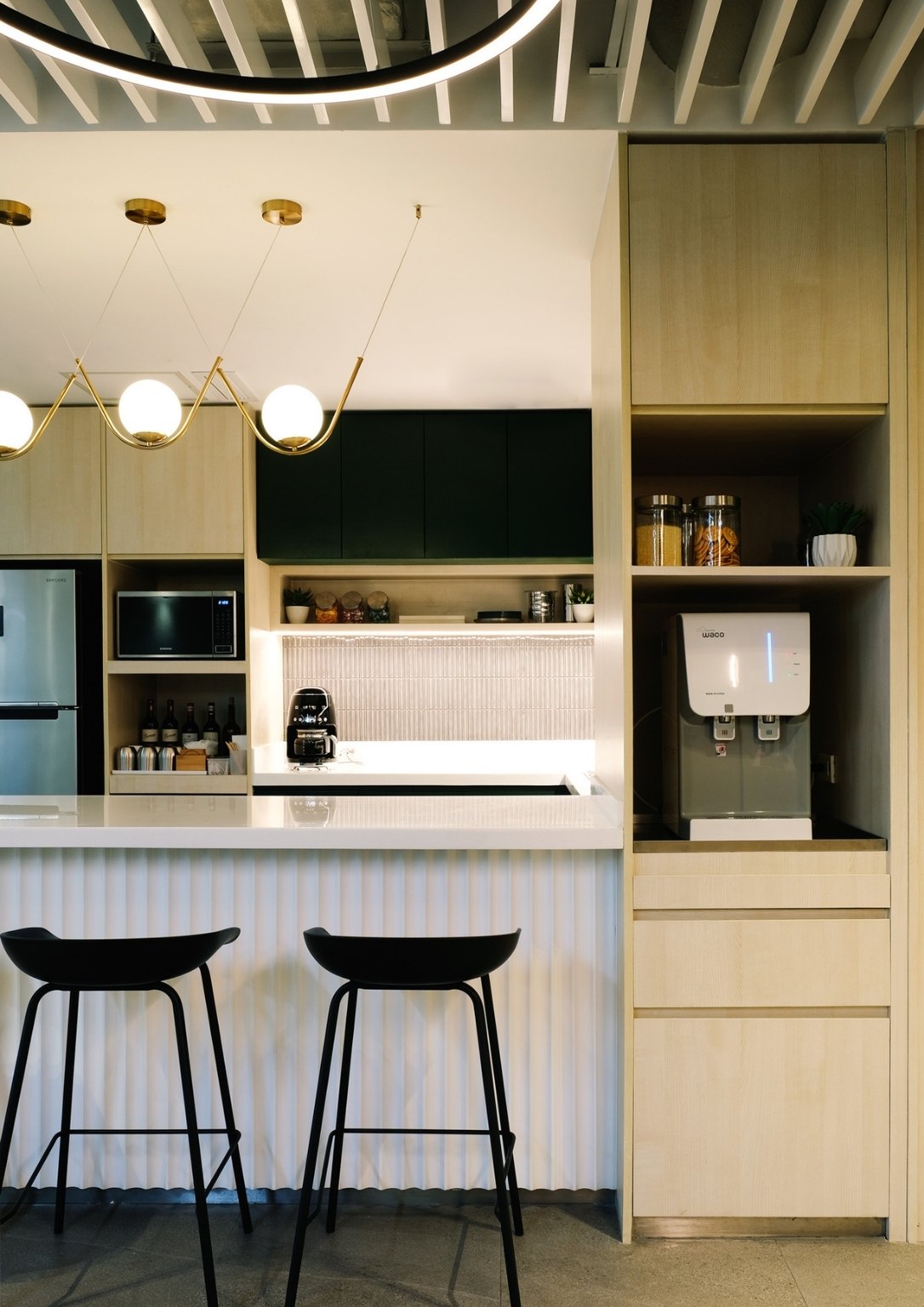 As with its home building, the project features features linear lines and low-key, neutral tones to make the interiors more calming to the eyes. According to Coleen, they also added dark green accents to create a sense of a healthy and professional workspace.
