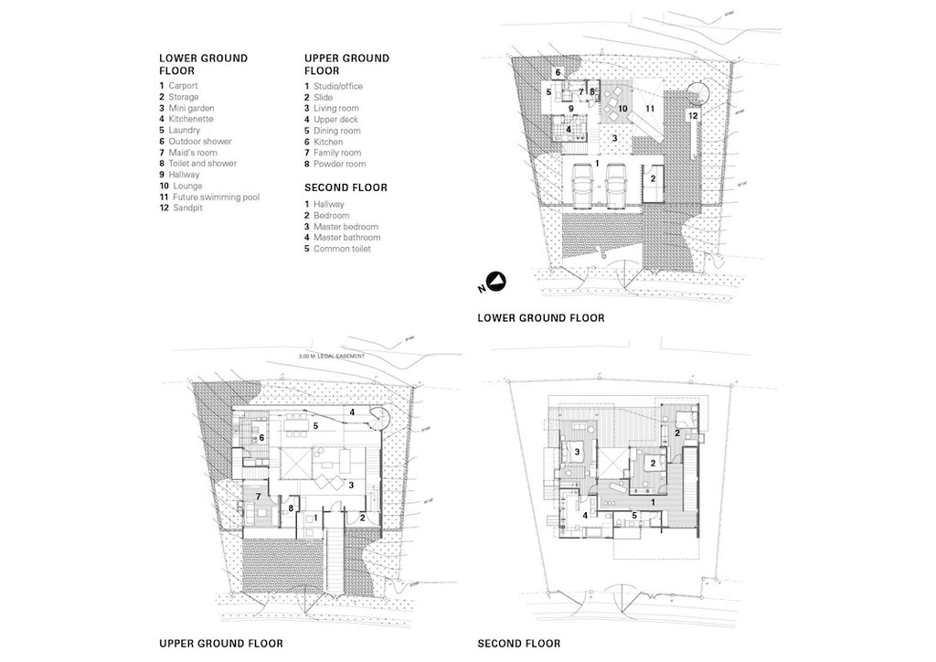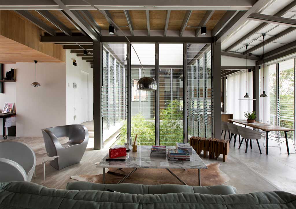 All the family spaces are arranged around the tiny ‘indoor garden,’ which provides the means for cross ventilation, and for warm air to escape (hot air always rises, while cool air descends). The opening goes all the way through the second floor and the roof above, allowing the bamboo planted below to grow as high as it could.