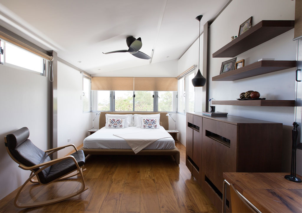 The master bedroom has windows facing the north, south and east, with openings close to the ceiling as well as the floor, ensuring heat does not accumulate in the room at any time of the day.