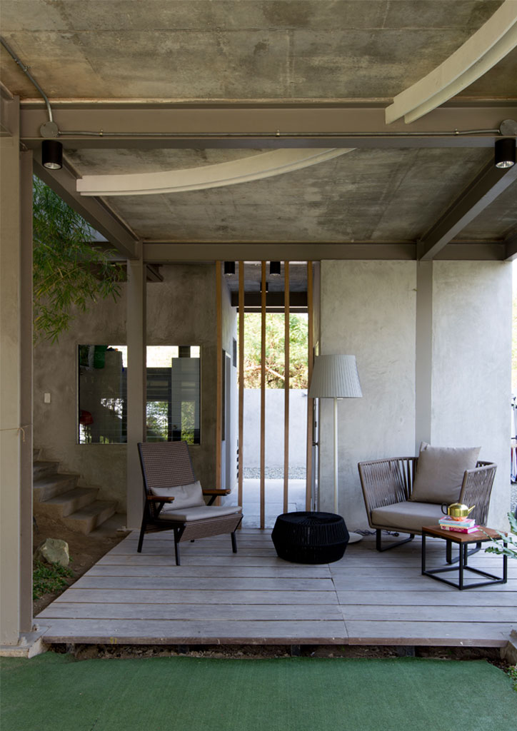 A conversation nook in the silong. From flooring to walls, Uy left the wood and cement exposed. “I consider this project the one in which I was really able to get as close to honesty of materials as possible,” Uy said. “I am lucky my clients were open to my experimenting.”