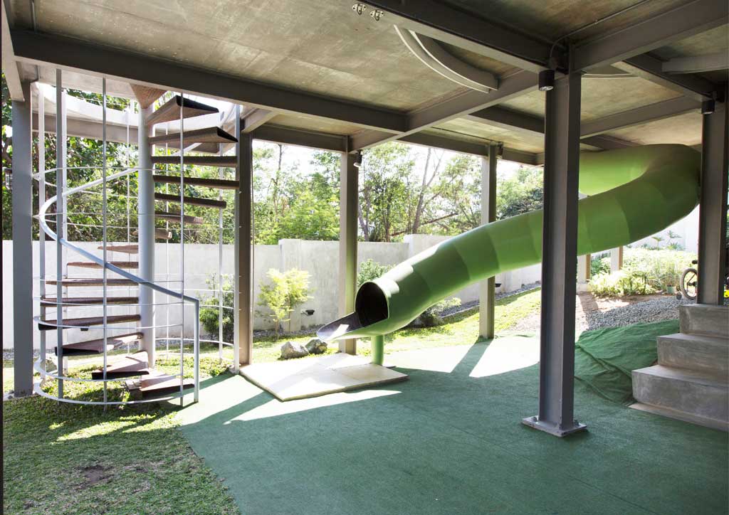 Below the house is a surprise for kids and adults alike: a bright green slide from the first floor to the silong. Also in the silong, Uy prepared the groundwork for a future pool when the couple can afford it.