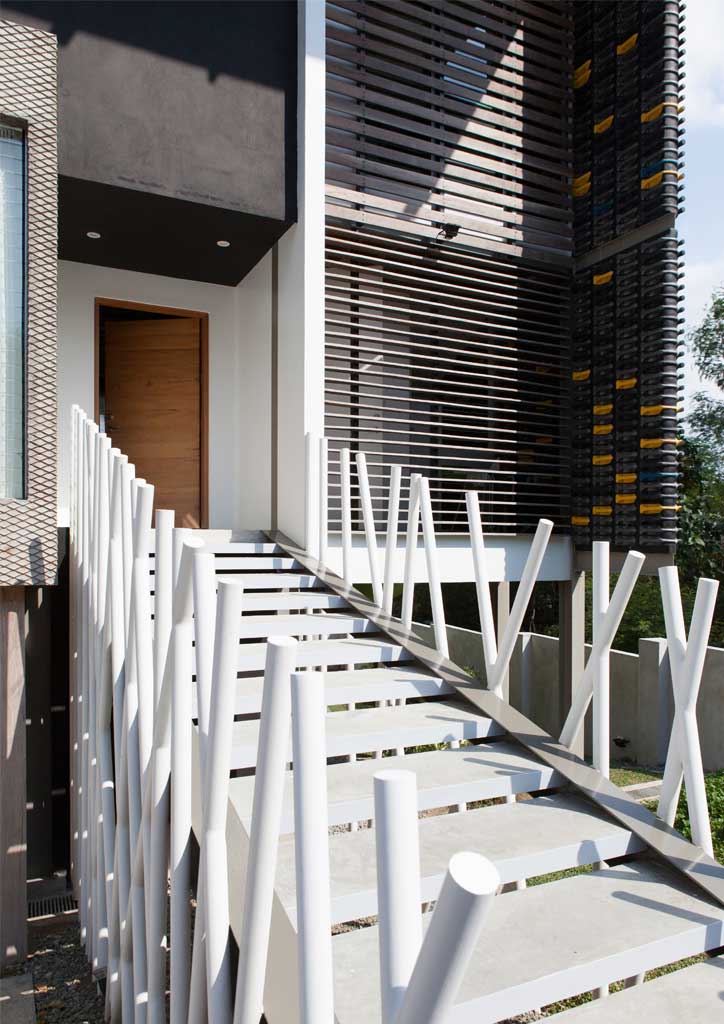 Firstly, the site was sloped. Edwin Uy always makes it a point to respect the natural characteristics of the sites he works on, so instead of leveling the ground, he raised the house on stilts, which helps cool the house from bottom to top and will continue to do so even as neighbors start building beside them, restricting air flow from the sides. The air circulates through a light and ventilation shaft Uy inserted right in the middle of the house. The square-shaped void pierces through the first floor, the second floor, and the roof, and is lined on all sides with jalousie windows.
