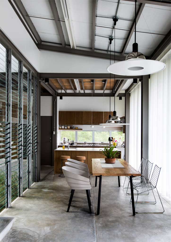 The simple dining area, like all the other areas of the house, is bathed with light and air from all sides despite the modest space it occupies.