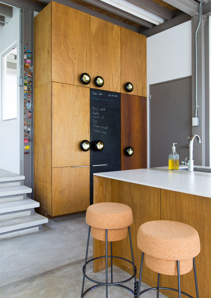 Appliances, cooking utensils, and supplies are neatly tucked away in cabinets of plywood. On the other hand I-beams, electrical ducts, and plumbing pipes, are exposed.