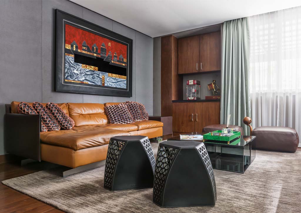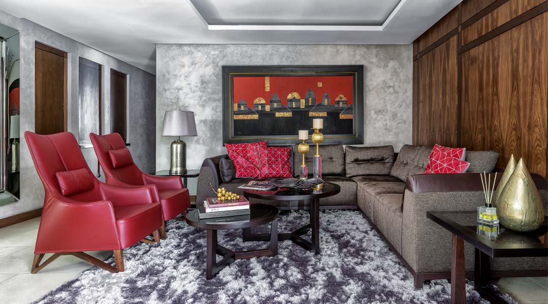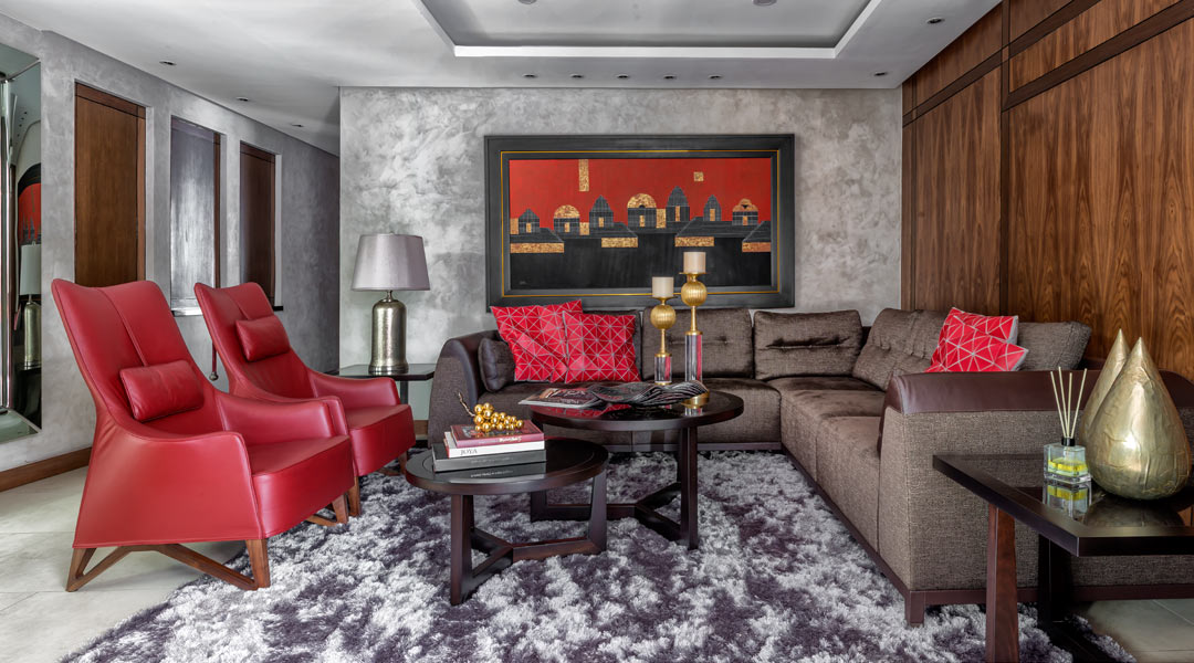 The main living room is a study in elegance and luxury with a rich color palette of browns and vibrant reds that match the Arturo Luz painting on the wall