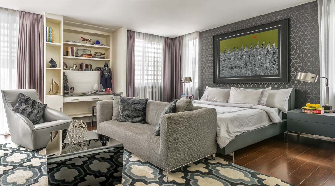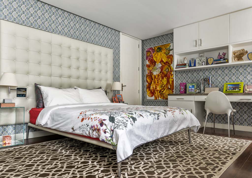 The eldest son’s room features geometric patterns as seen on the accent wall and rug. An Arturo Luz painting above the bed sets the tone in his space