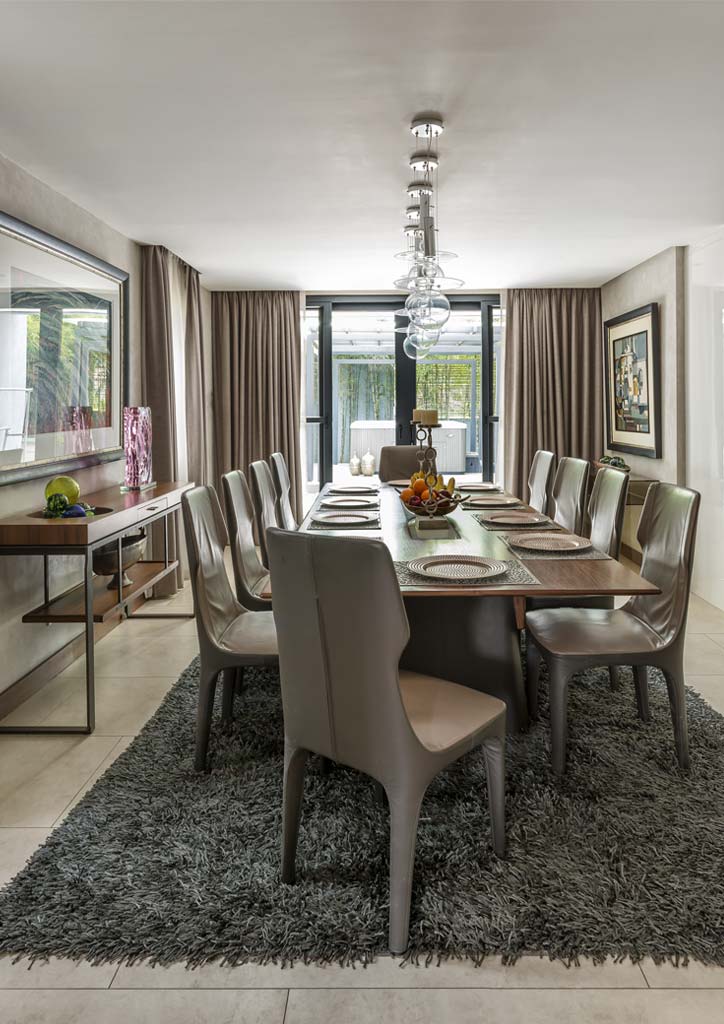 Leather chairs from Furnitalia give a modern vibe to the dining area. Cool beiges and grays keep the space sleek and simple