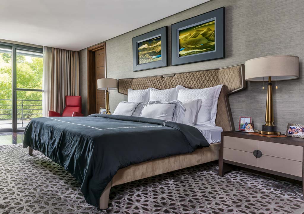 The master bedroom combines a variety of finishes in different tones. The wife specifically requested for the velvet headboard and printed rug
