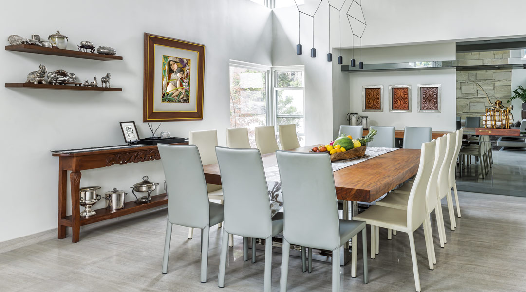 As a result, the house has an open layout where the living room, dining room, and kitchen can be seen at a glance. Visualizing a party is easy with a dining table that sits 14 and a kitchen counter that also doubles as both seating and buffet area.
