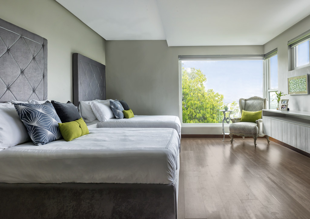 The couple also relied on Carol’s specialization in using textures, playing with neutral palettes, and incorporating a few surprising accent corners. The style of this home borrows heavily on modern elements. Warmth is brought to the main floor with wooden pieces such as an Atelier coffee table and three framed wooden pieces cut from the former house’s old door. The wooden flooring for the stairs and some bedrooms were upcycled narra planks from the now-demolished house of the wife’s grandmother.