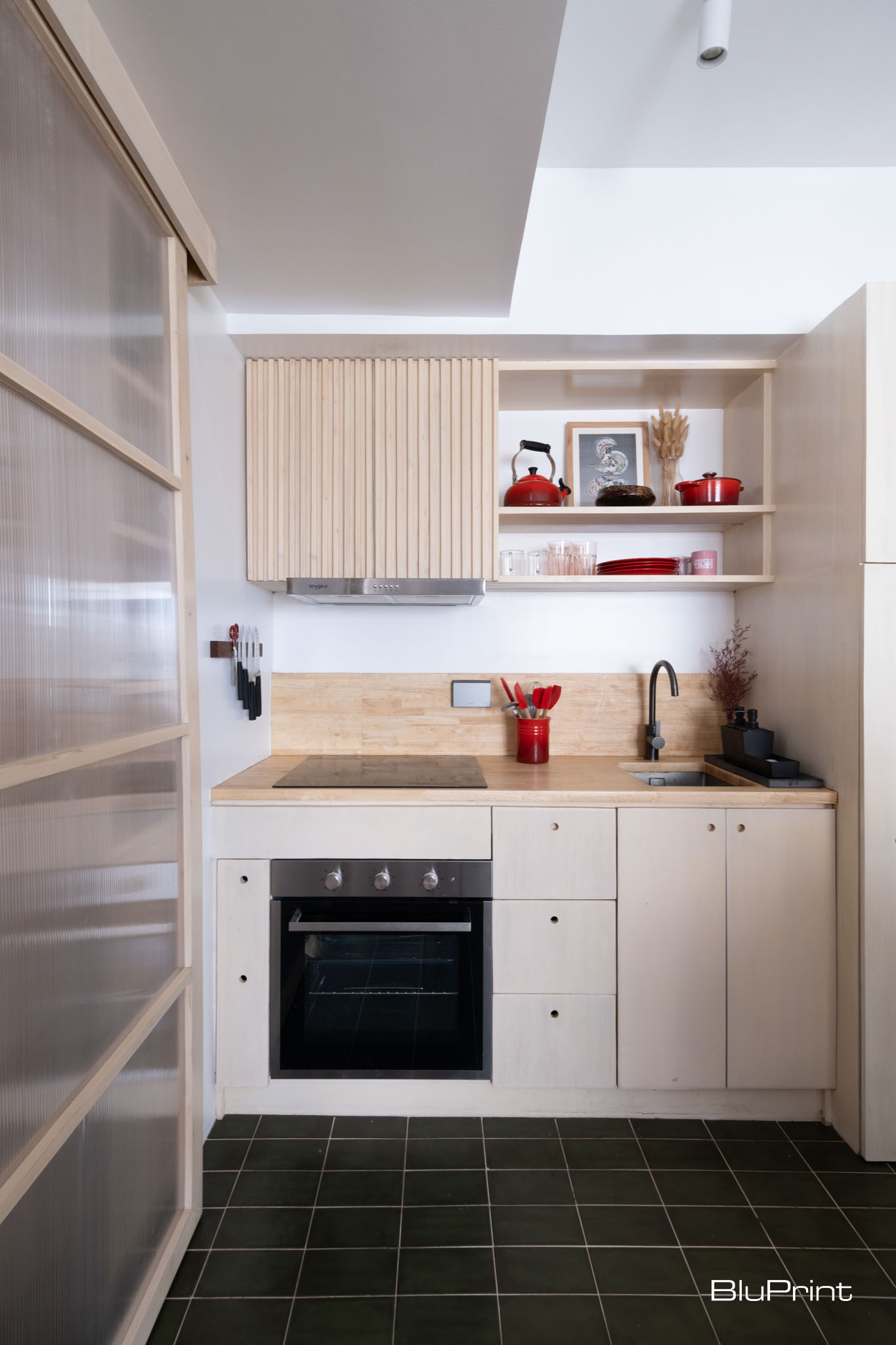 The kitchen is neatly organized with closed cabinets that store appliances and cooking essentials, while green tiles delineate the cooking area, allowing Calvento to embrace his inner homebody with ease.