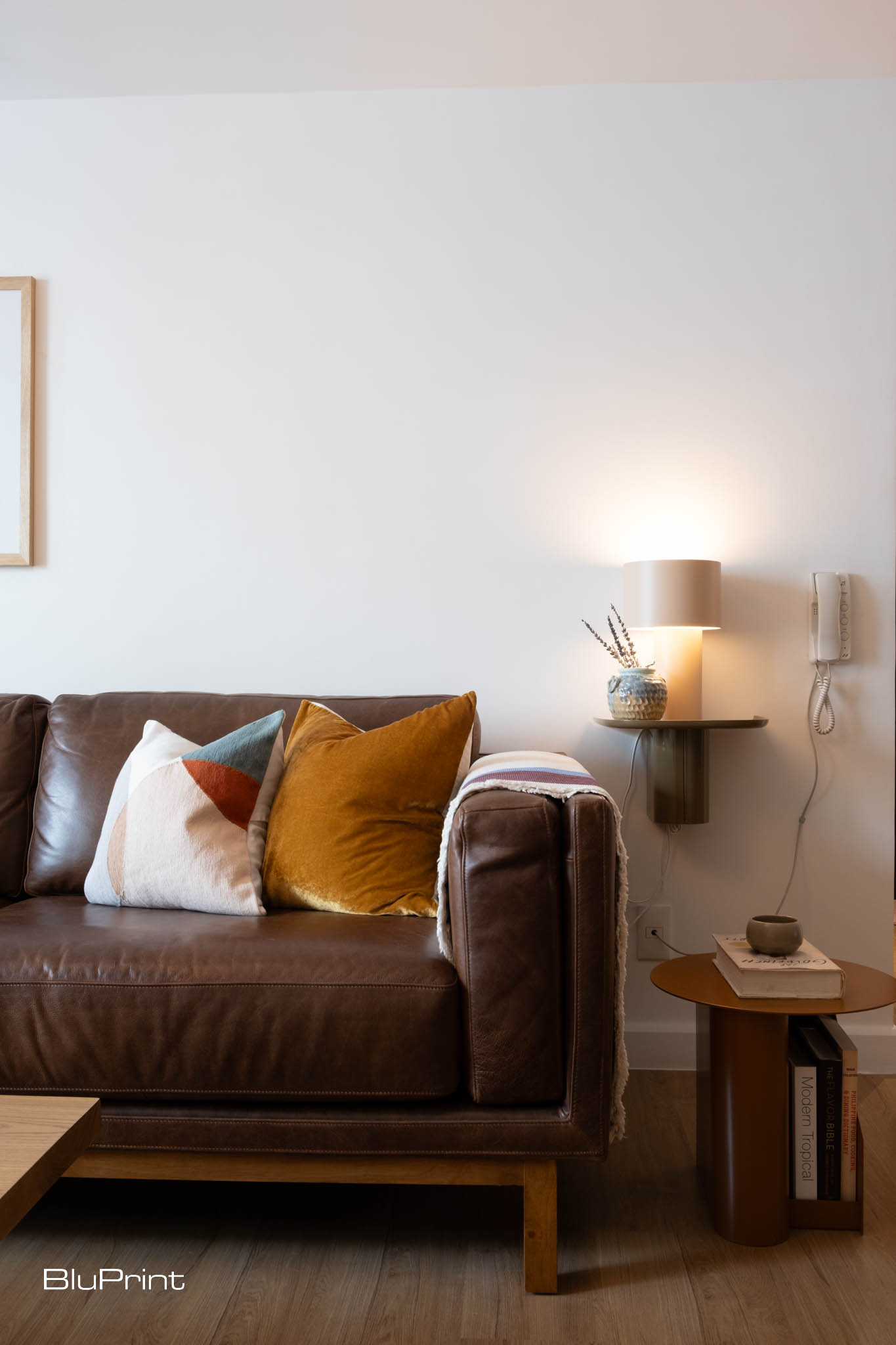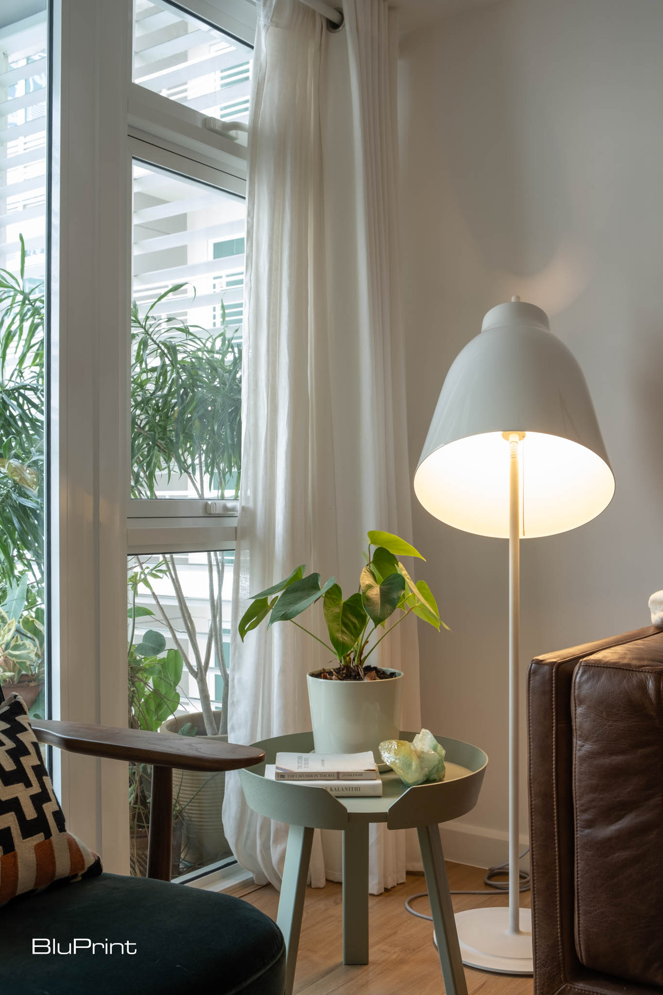 Moving further inside, the living area showcases a live edge shelf and a cantilevered console. Both highlight the partners’ appreciation for natural materials and thoughtful design. The leather sofa and designer armchair create a cozy nook perfect for relaxation. Just outside, the small balcony serves as a mini oasis; a perfect spot for enjoying coffee or a quiet moment amidst the greenery.