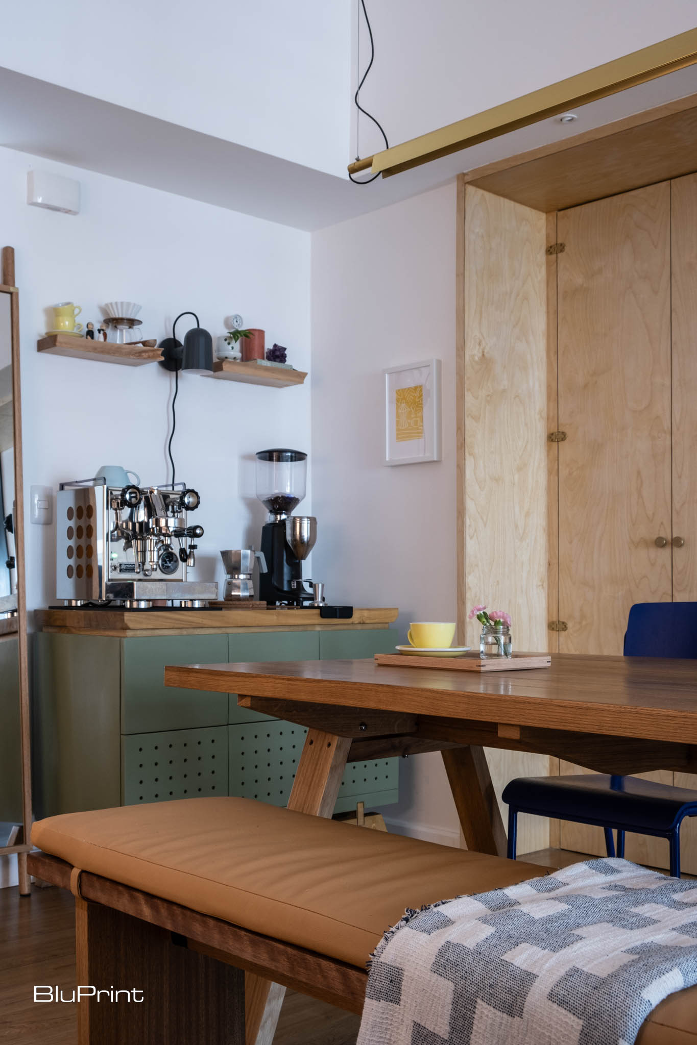 As you enter, immediately to the left, is a custom piece of cabinetry they designed and built themselves. This houses their espresso machine, grinders, and other coffee paraphernalia. A small poster of a moka pot, entitled “7AM”, hangs above it, which incidentally, is the same time they have coffee every morning.