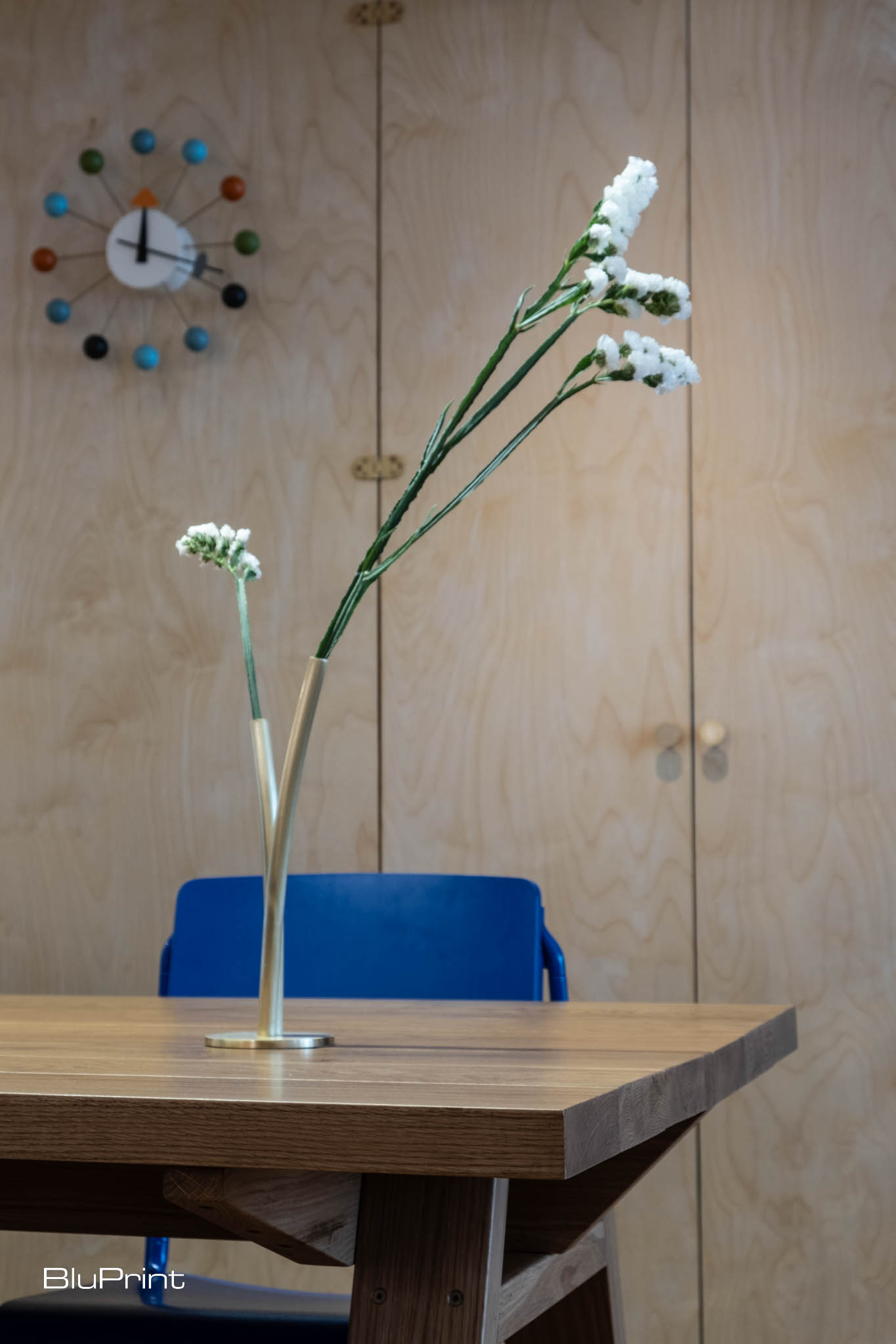 Adjacent is a custom wooden dining table made by one of their favorite partners, Lamana, a local furniture maker working with Ishinomaki Laboratory in Japan. It sits under a brass lighting fixture accompanied by blue chairs from HAY and a custom bench, which they also built and designed themselves.