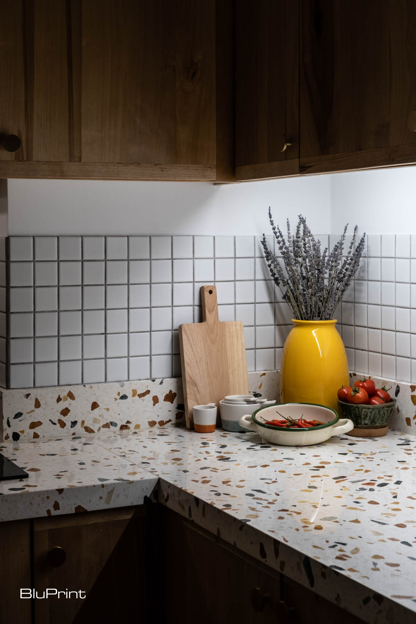 The kitchen, with its Birch plywood cabinets and colorful terrazzo countertops, presents a functional yet visually engaging U-shaped layout.