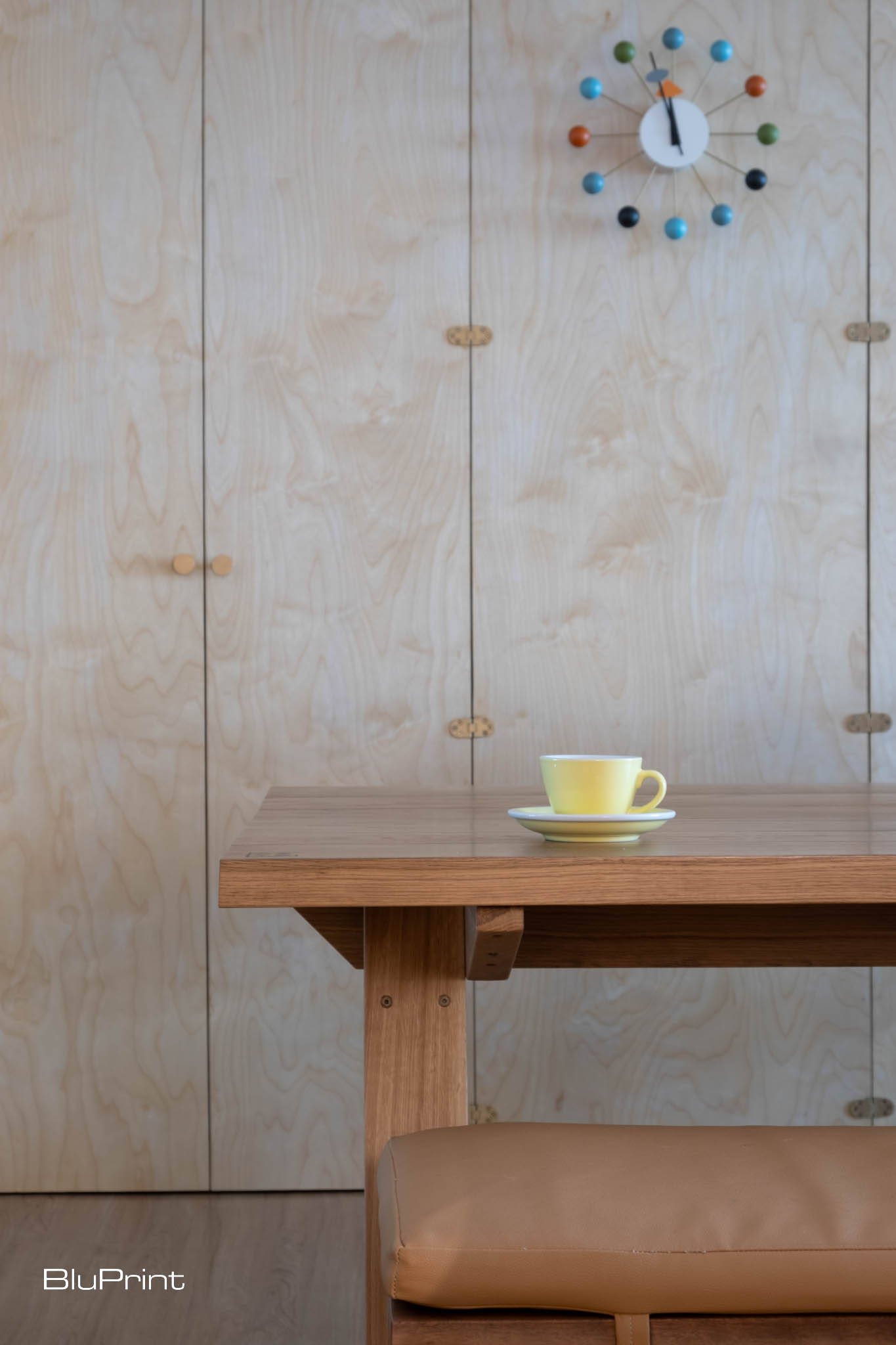 Stepping into Jody and Russell’s apartment, the main living space unfolds with an inviting warmth. One of the first things you’ll notice is the Birch wood cladding that spans the length of the dining and living area. This serves to anchor the entire living space, and at the same time, draws your eye to the outdoor area.