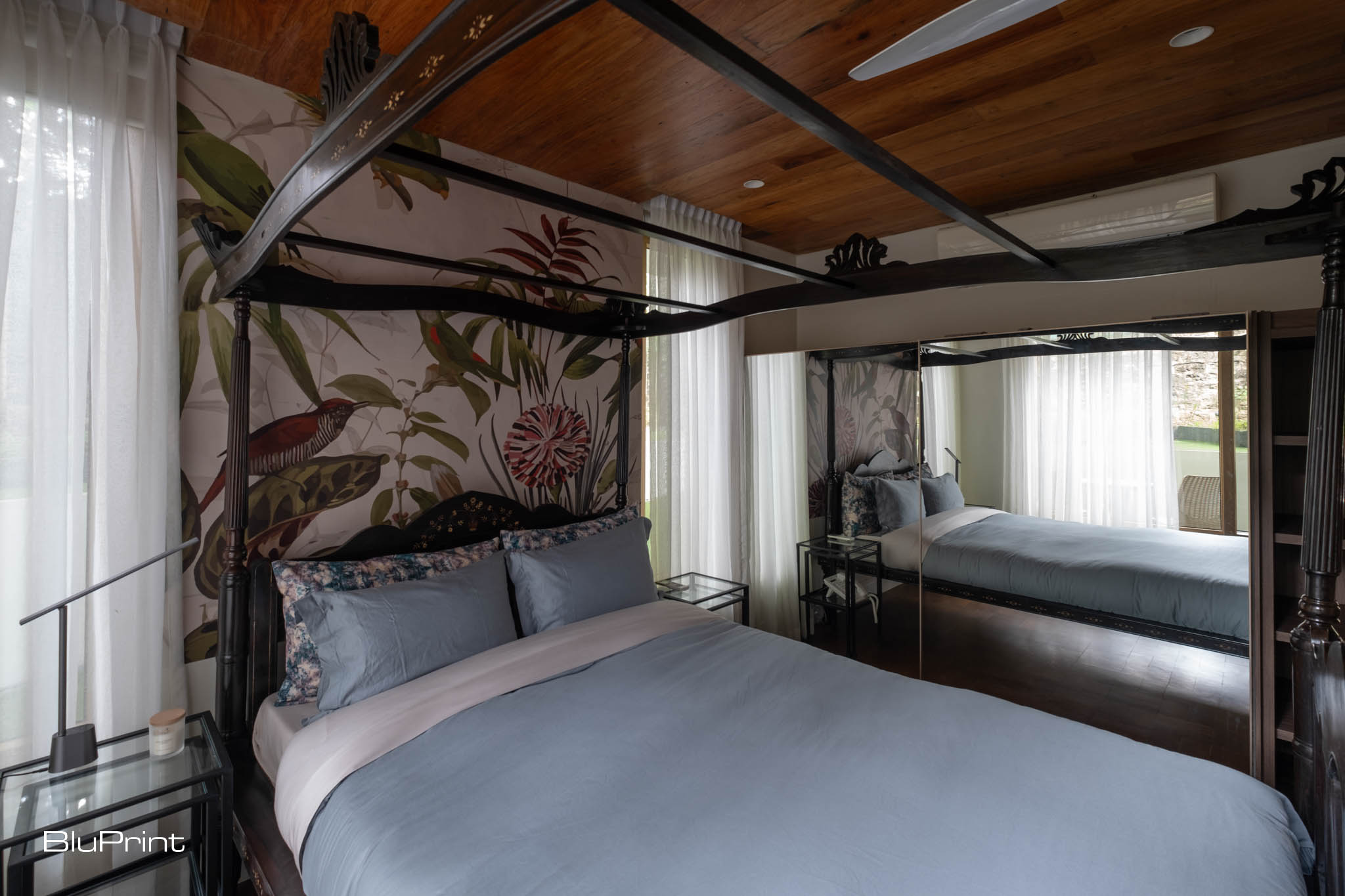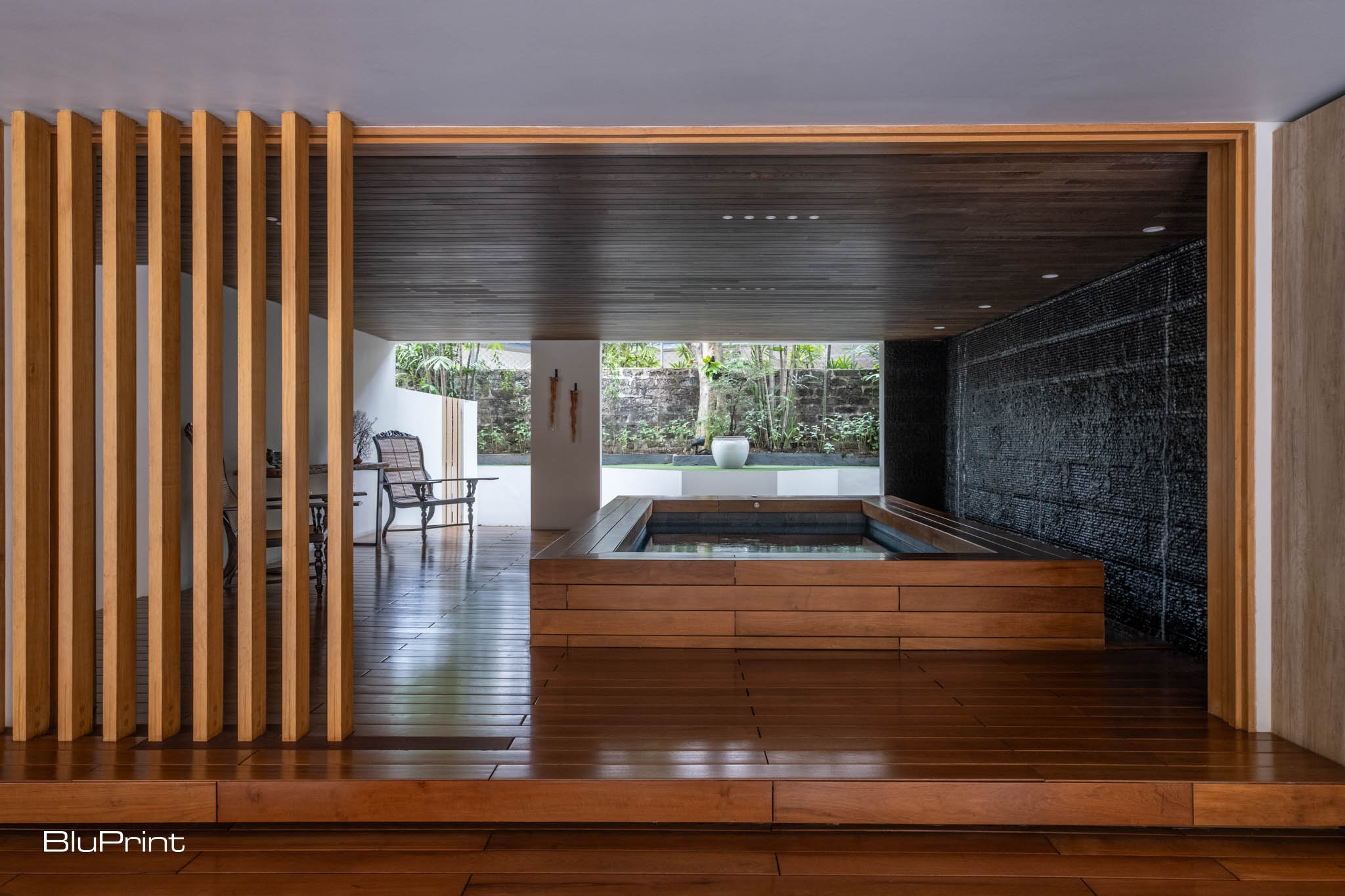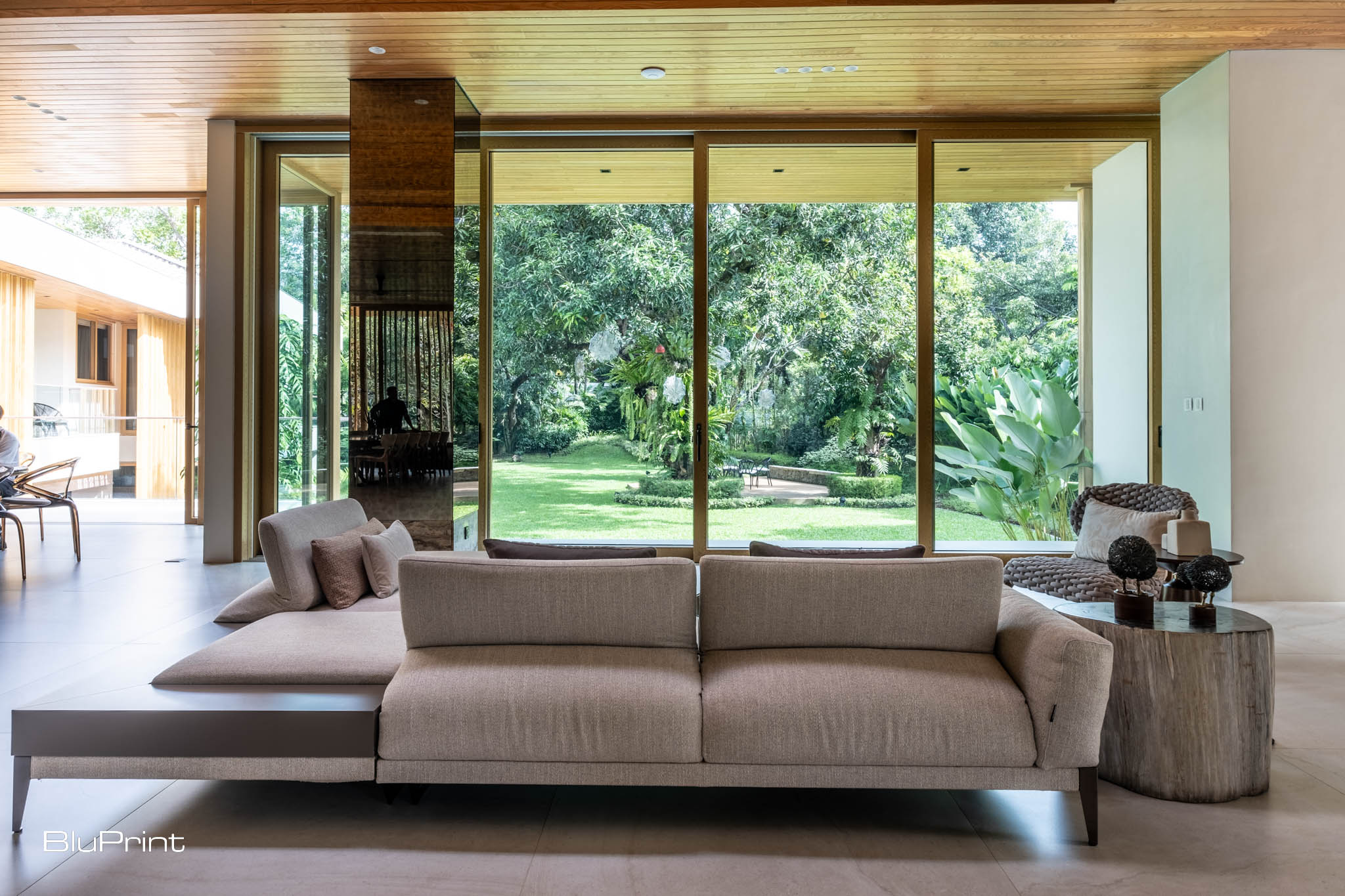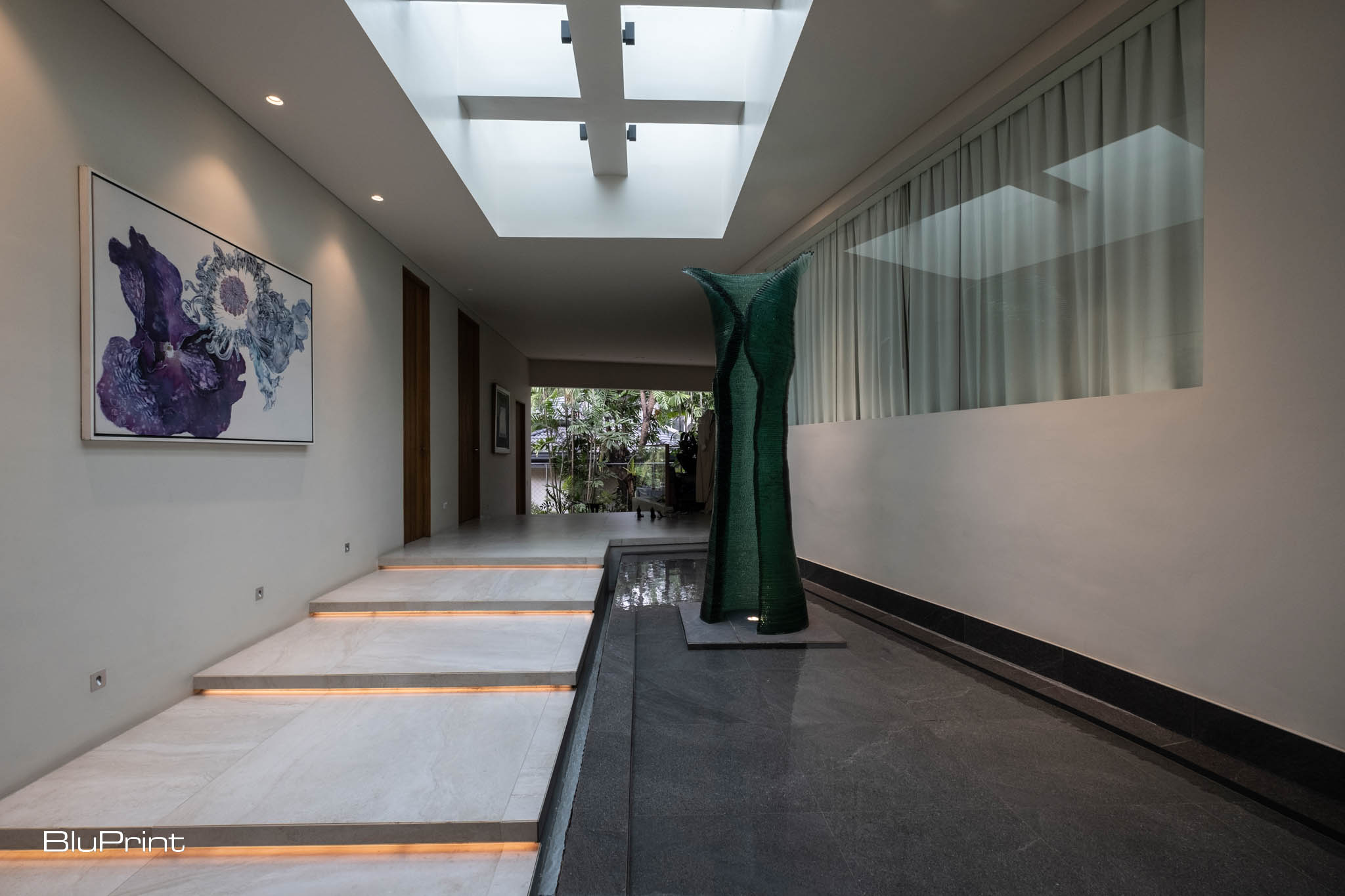 One of the home’s most captivating features is its semi-covered hallway, connecting common areas to private rooms. Bathed in natural light and open to the outdoors, this passage creates a graceful flow from public to private spaces.