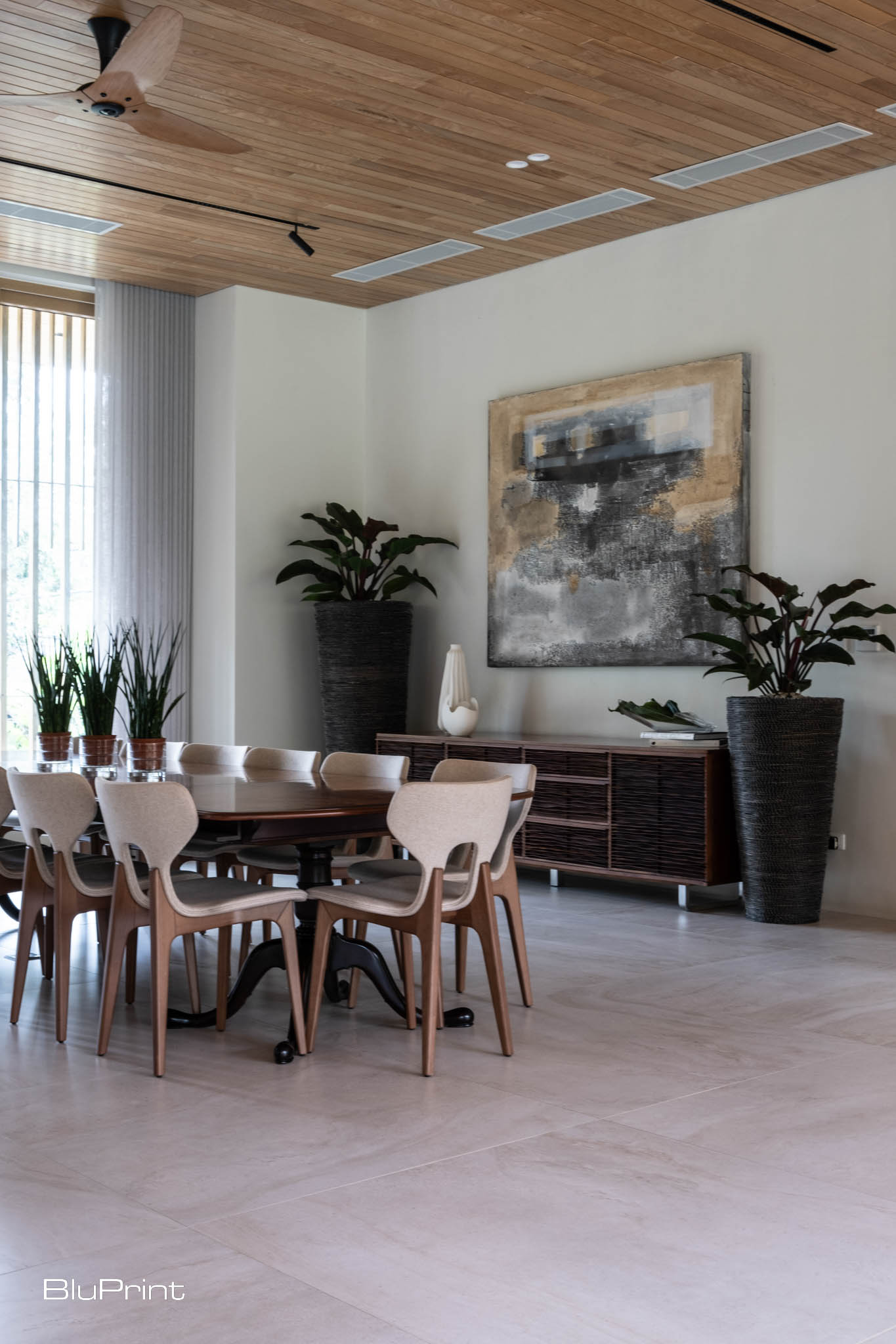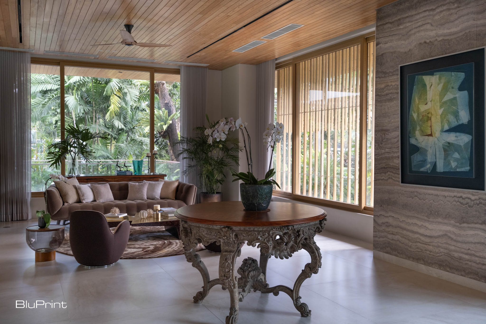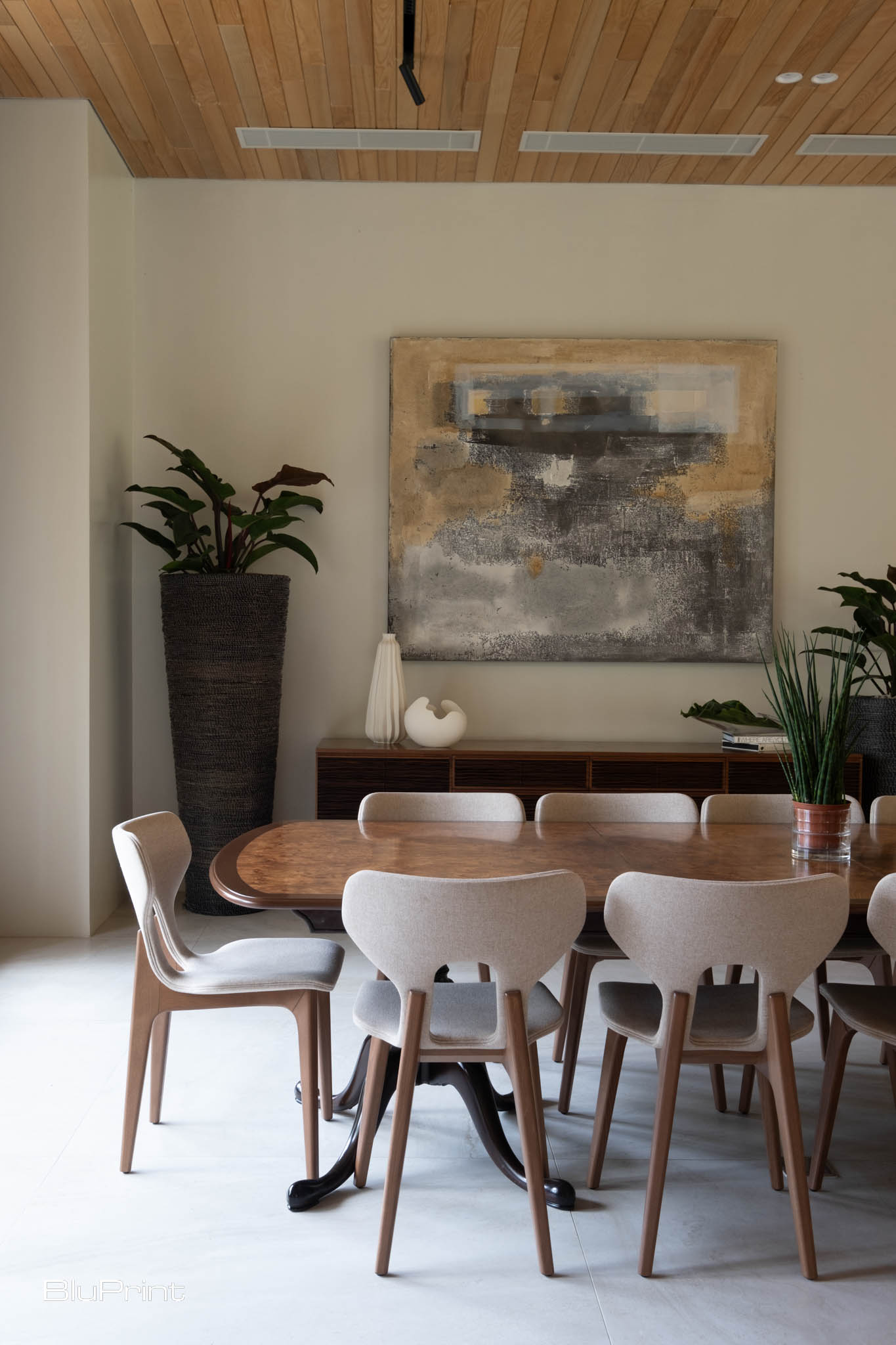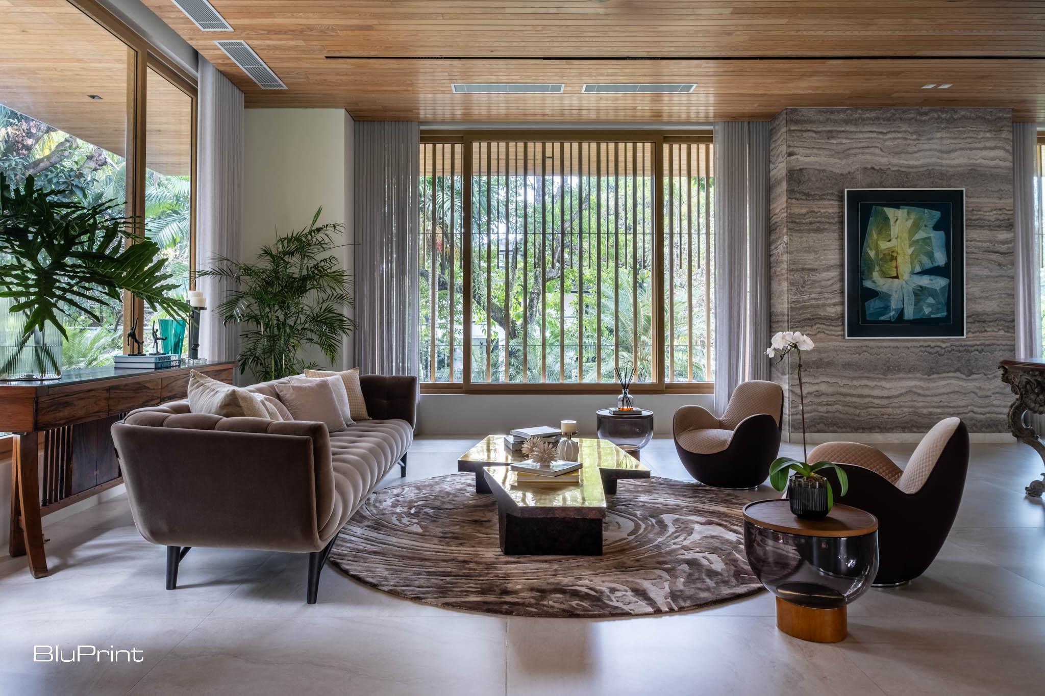 The walls of the great room showcase the art collection of the homeowner, including pieces by Fernando Zobel and Arturo Luz. They were carefully curated to complement the furniture pieces and Nazareno’s chosen materials and color palette.