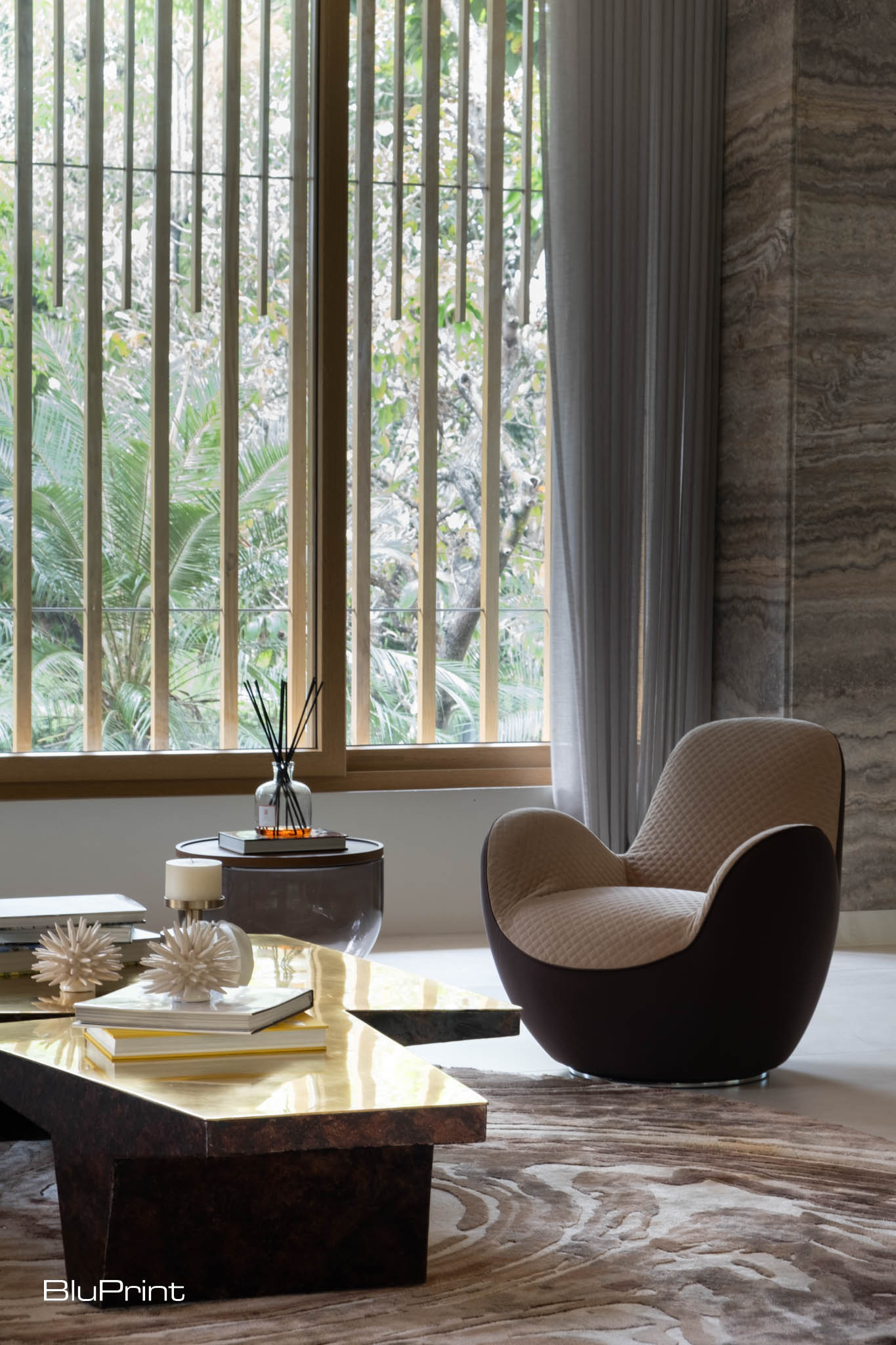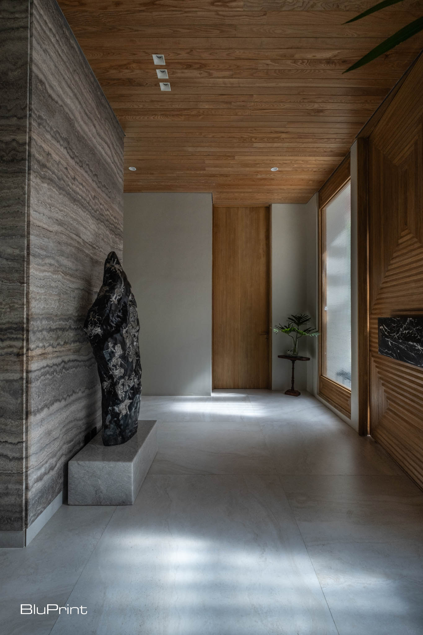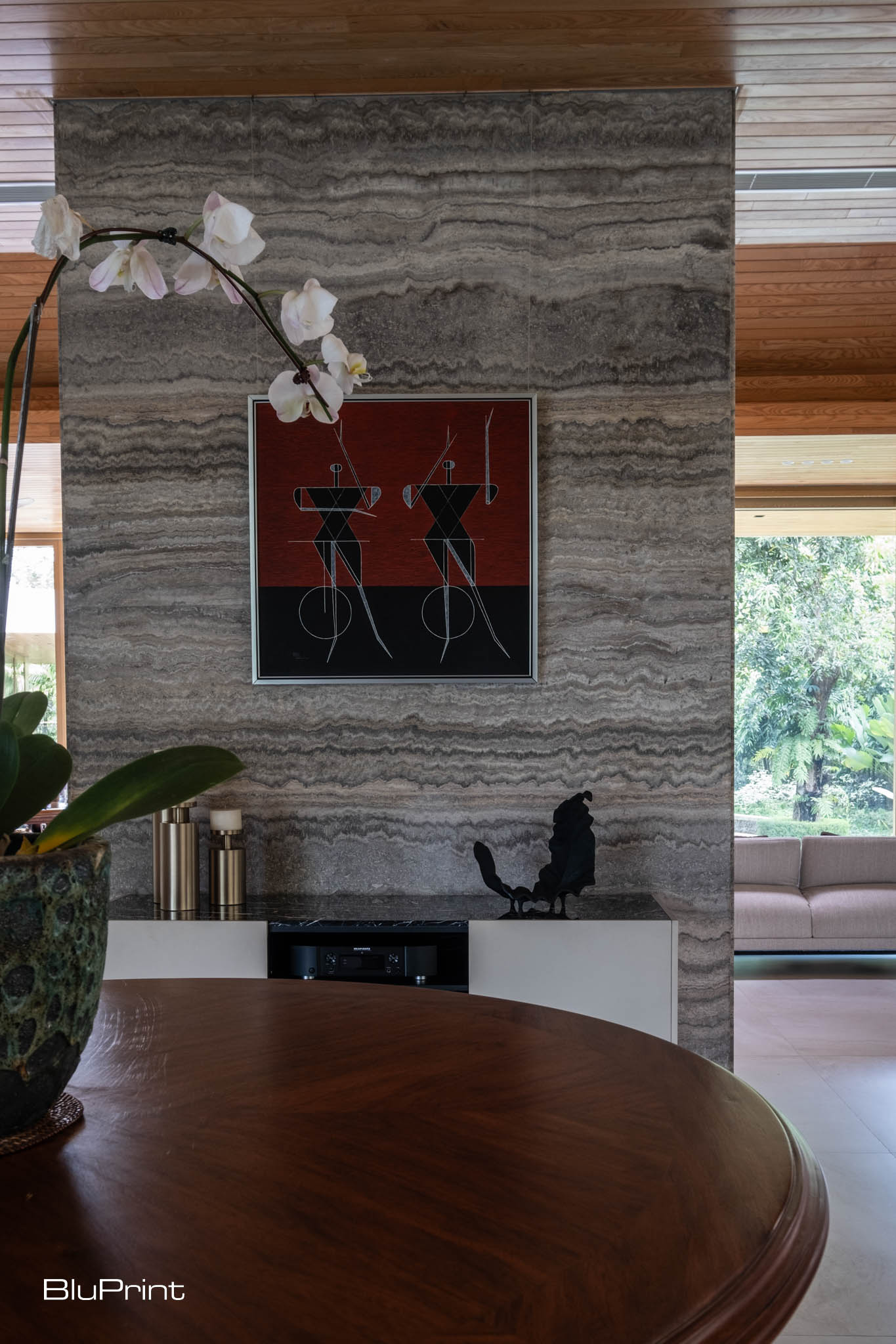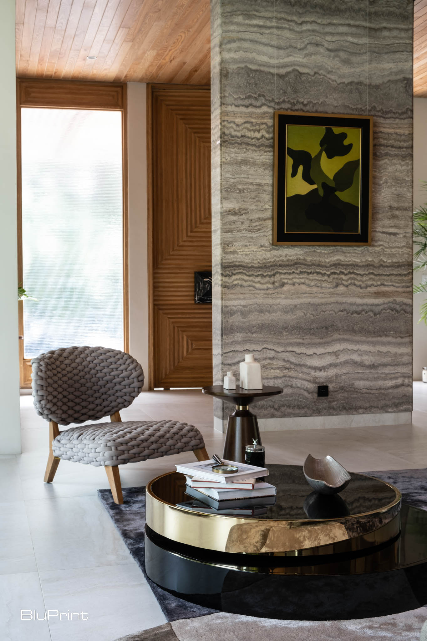 Complementing the wood elements, Iranian travertine was selected to add a tactile quality to the surfaces throughout the home. “It’s not filled or polished, so you can feel the material’s natural satin nature, which I loved,” Nazareno explains.