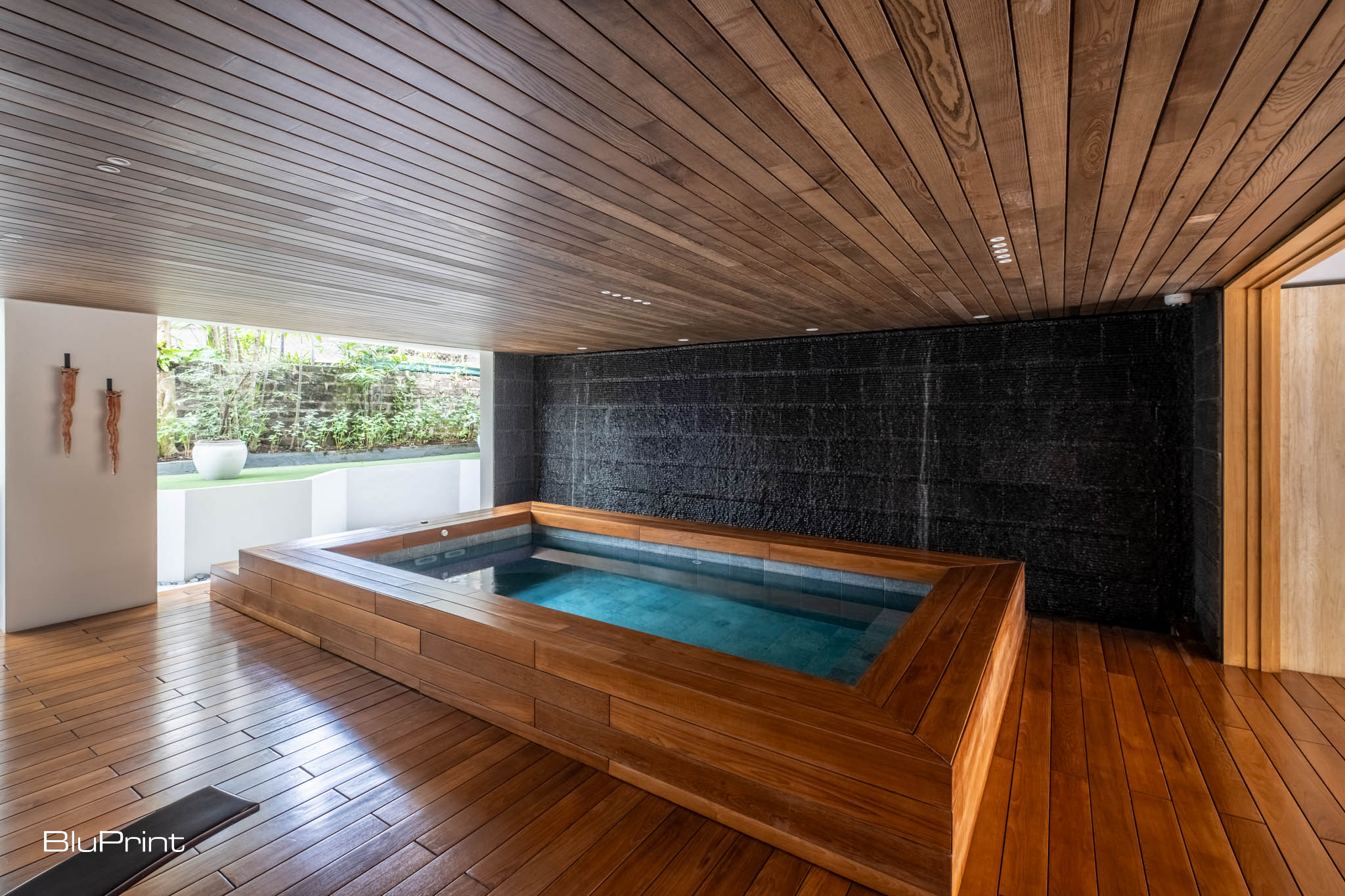 “She never had a pool before, and I was dying to give her one,” Nazareno says. The pool was designed to be adjacent to the gym, creating a seamless indoor-outdoor feel. The fitness center was left open to nature, with no doors or windows to enclose it fully, giving the homeowner a sense of freedom and connection with her garden. This open design allowed for natural ventilation, ensuring that the gym and pool area never felt confined.