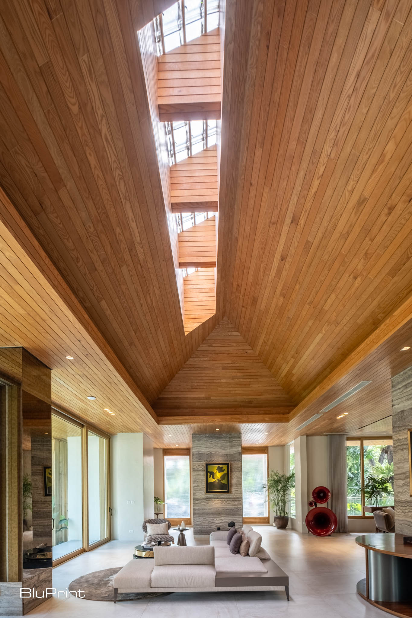 To balance the scale of the house and create a more inviting atmosphere, Nazareno chose a material palette that focused on tactile, light-toned materials. Blonde-colored wood was a key element, used both indoors and outdoors, to create a cohesive and warm aesthetic. For the interior, ash wood was chosen for its soft, natural tone, while Accoya wood was used outdoors for its durability and similar color palette.