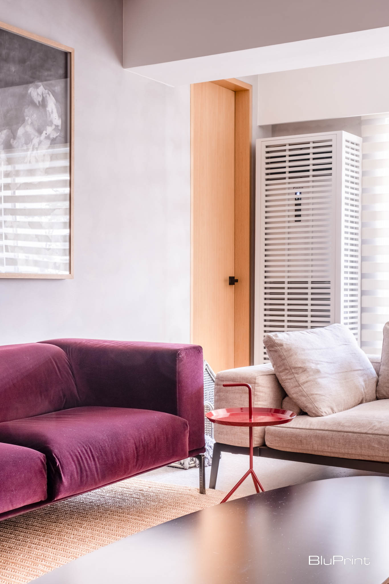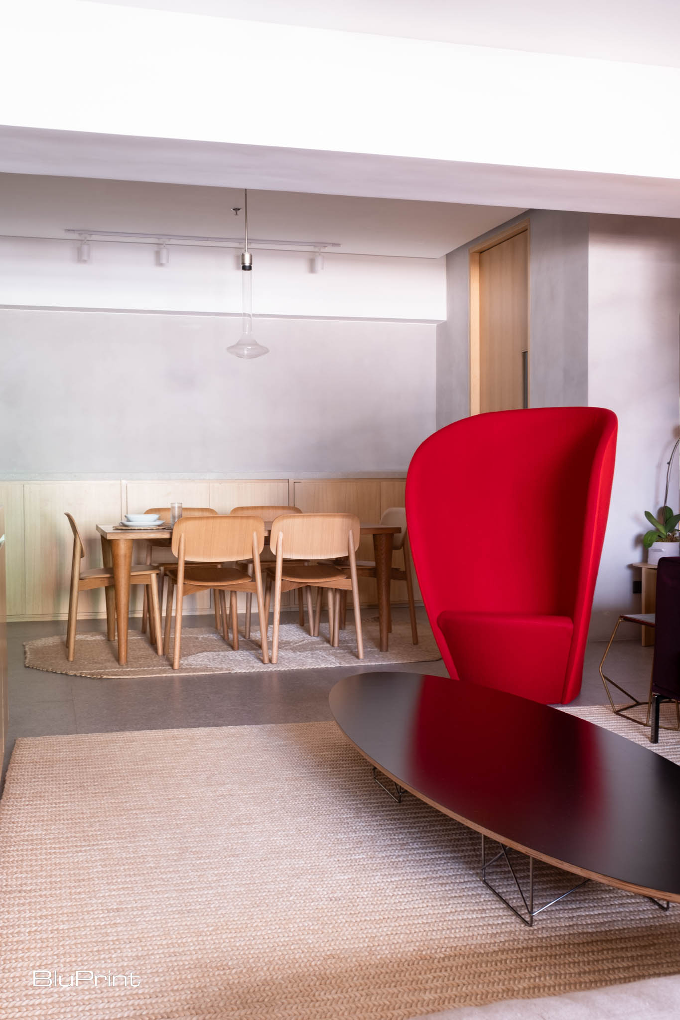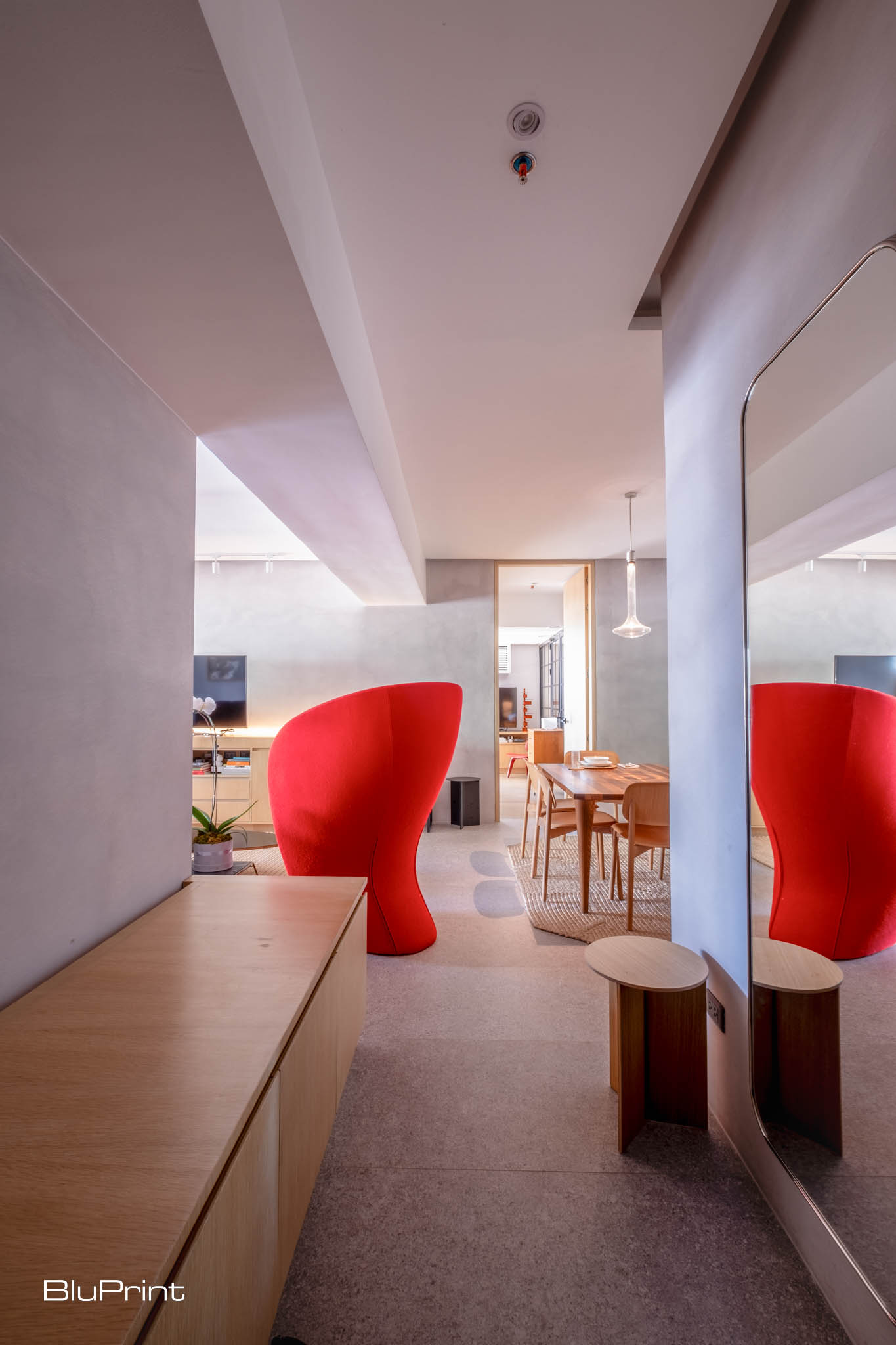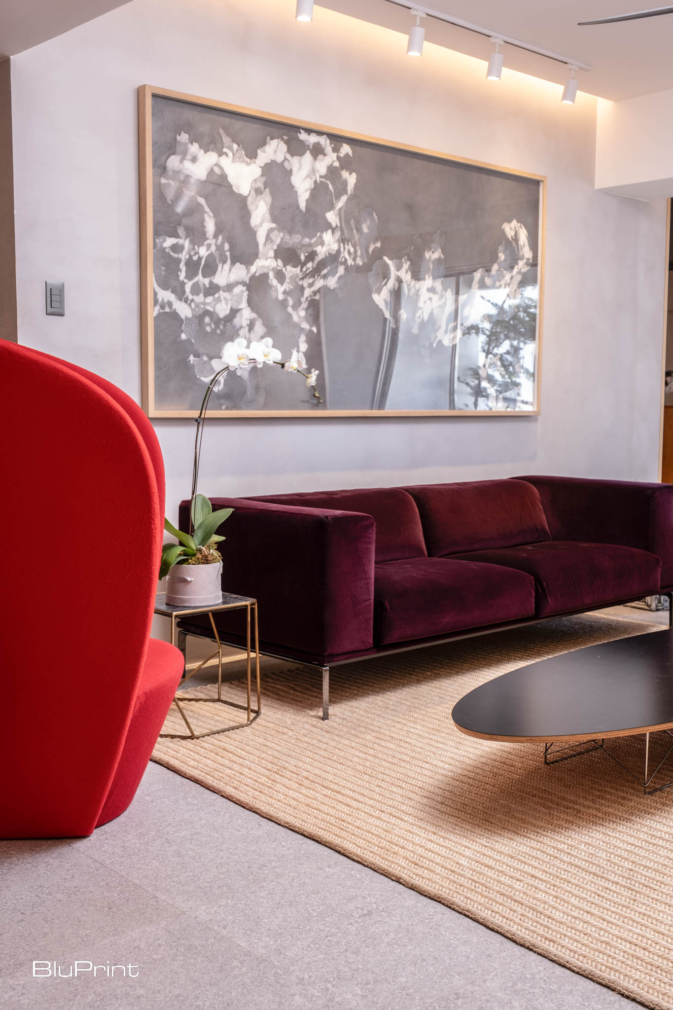 Parallel to the dining area is the living room where Ravelas includes touches of her favorite red color and furniture collections. Near the balcony is the white sofa bed and the deep red couch directly facing the TV. The designer also added a striking red Herzog accent chair for personal quiet moments. A massive artwork by Lui Medina highlighted by the track lights also decorate the area.