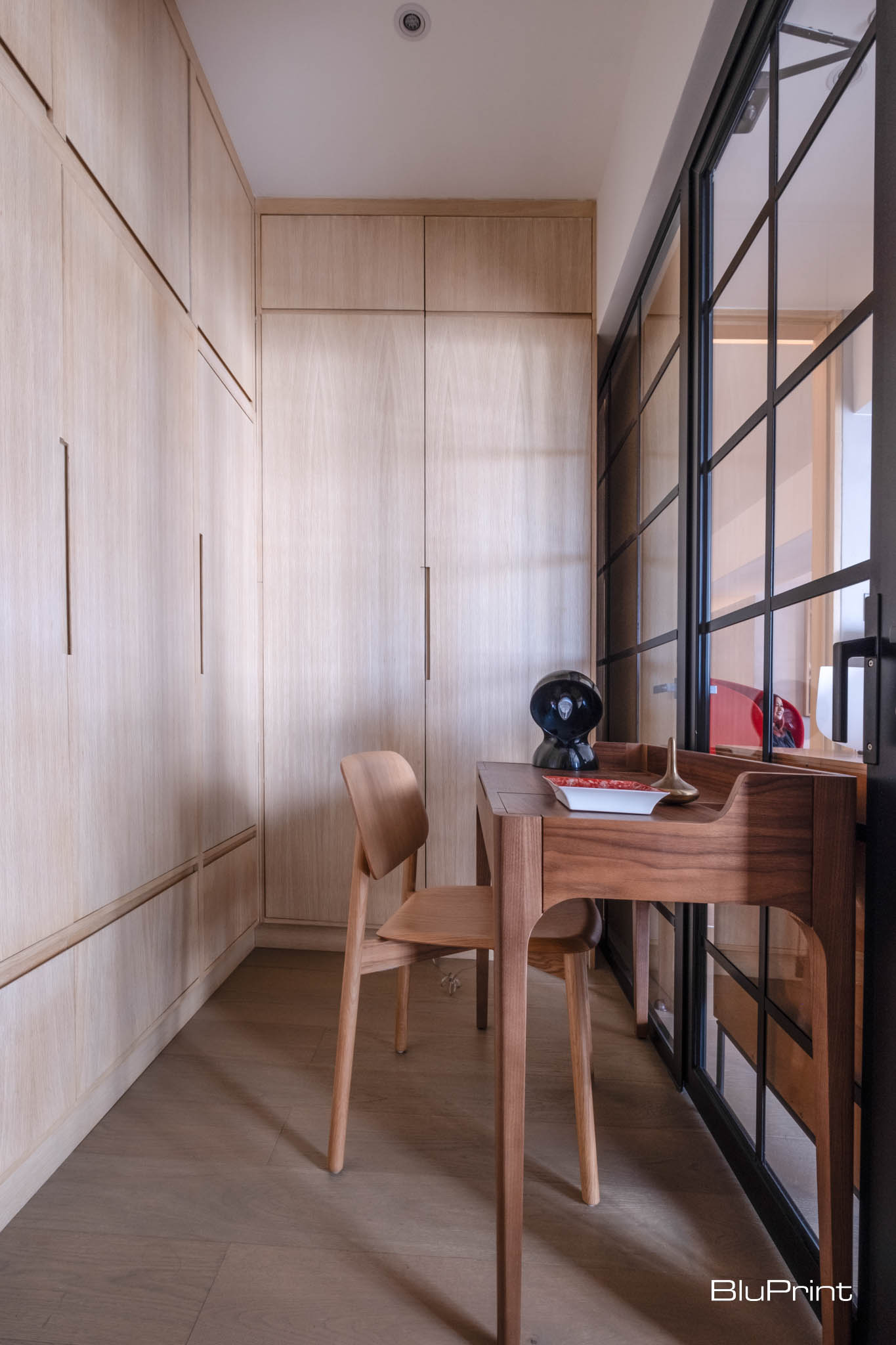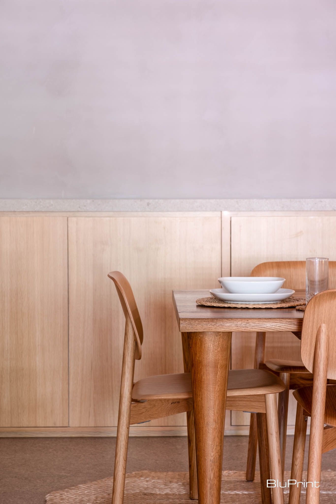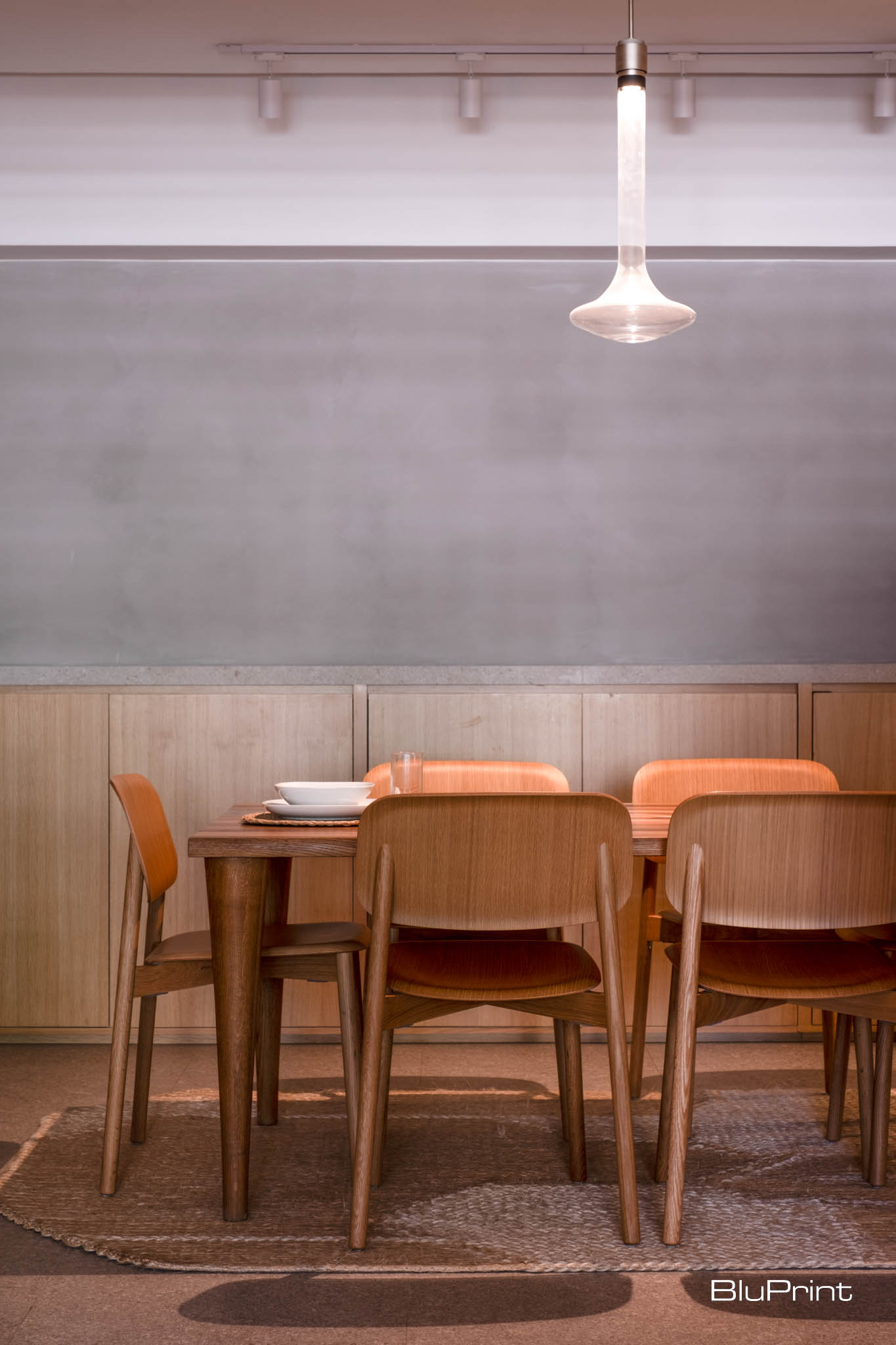 On the right side is the dining area with predominantly wooden accents for the 6-seater dining set, doors, and cabinets. The placement of warm ceiling track and strip lights enhance the white walls and negative space in the room. Next to it is the tiny kitchen surrounded by wooden cabinets and countertops, which also serve as essential storage.