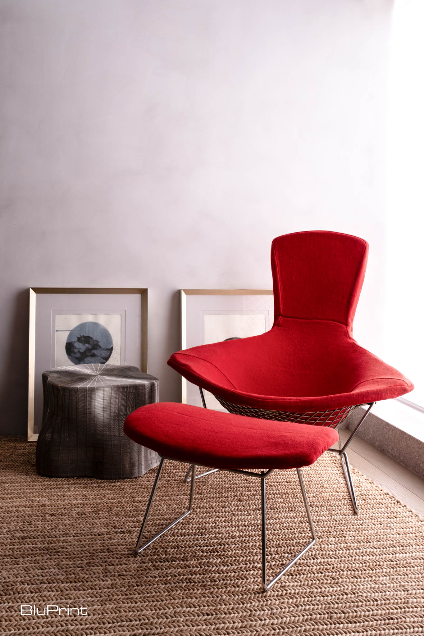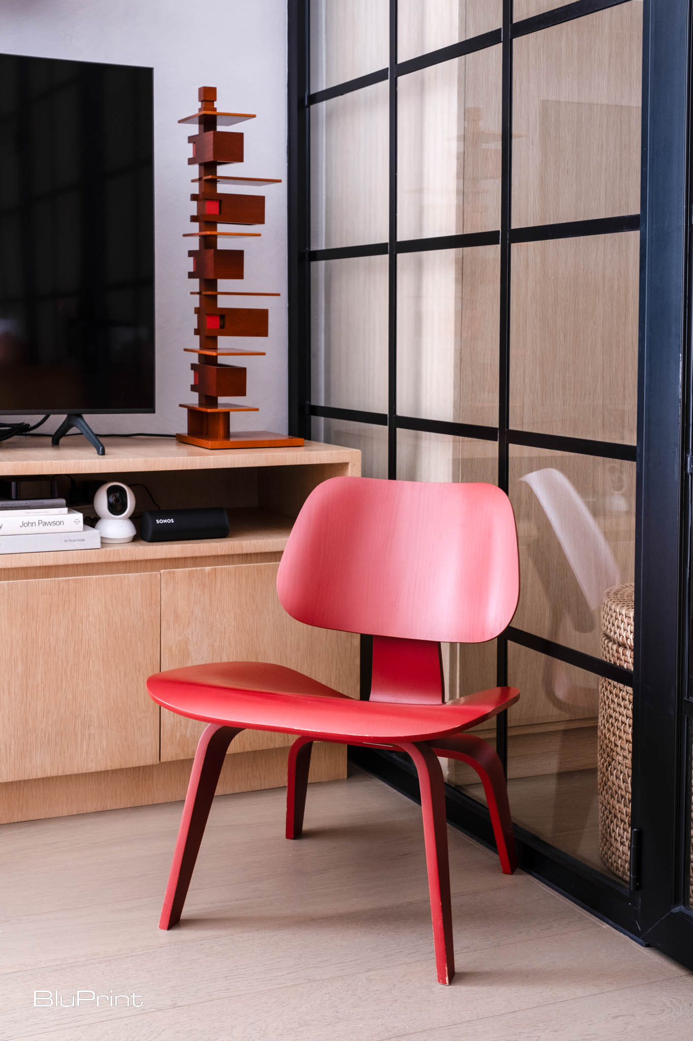 The bedroom window overlooks a balanced sight of the city life and natural view from the balcony. Ravelas kept the walls clean by placing the framed decor on the floor, and added an abaca rug by Nazareno Lichauco. The inclusion of red chairs also emphasize the empty white walls to make the room feel more spacious.
