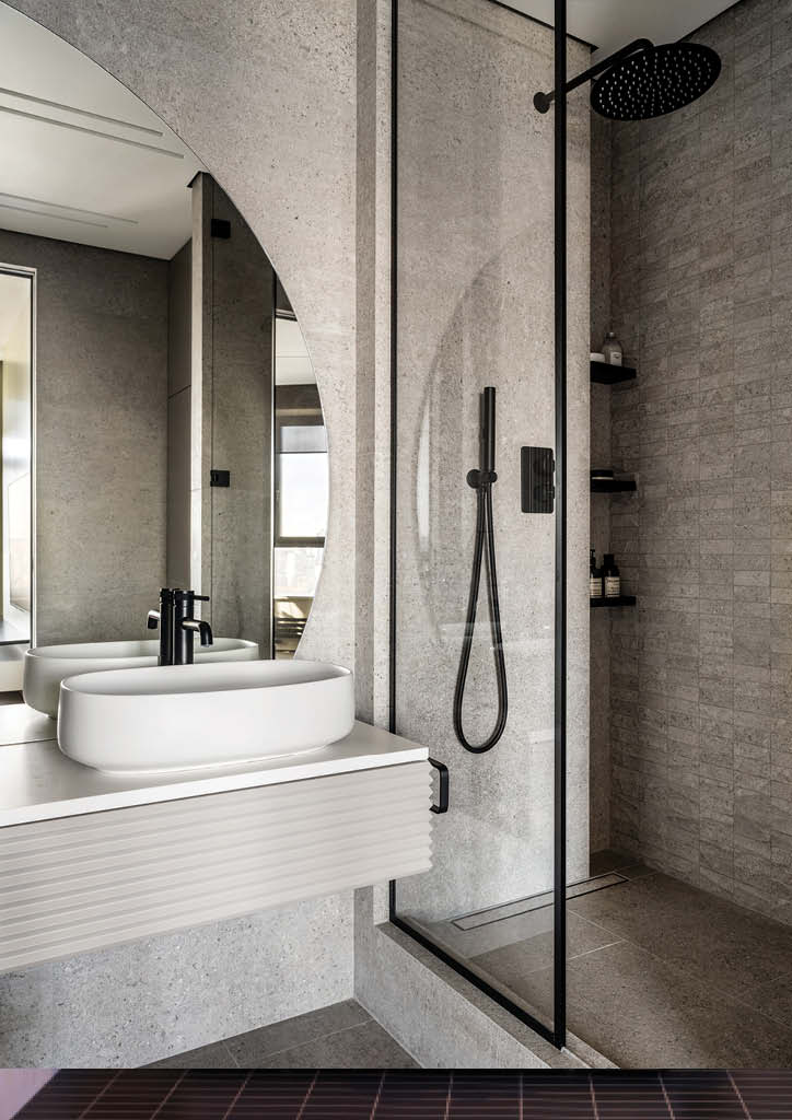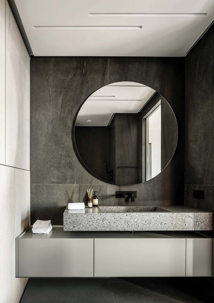 The team produced a round-shaped mirror for this bathroom. They finished the whole bathroom with porcelain stoneware with a concrete texture. Together with the radial mirror, it gives the sensation of the moon landscape.