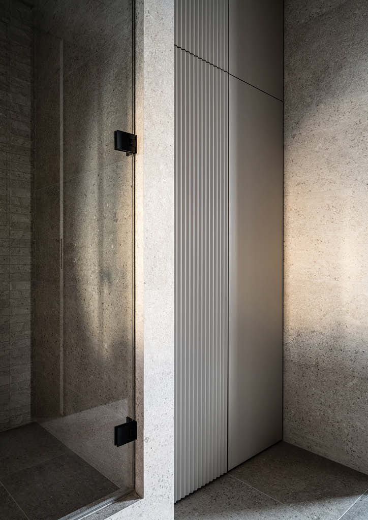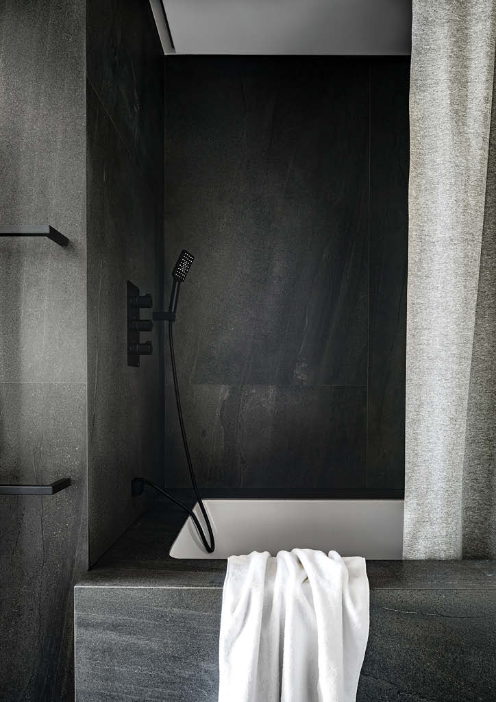 The bathroom looks like a monolith block thanks to the porcelain stoneware finish. The faucet of the bathtub is built-in into its frame.
