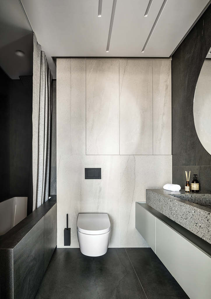 At the entrance, the dark porcelain stoneware continues in the graphite facades of the second wardrobe. The team placed two big mirrors and a console with the down backlit in the hall. The cabinets’ bodies are black but they made a backlit that automatically turns on when one opens a cabinet to make it easier to find a needed item. This backlit is set not only above the hanging rods but above the deep shelves for shoes.