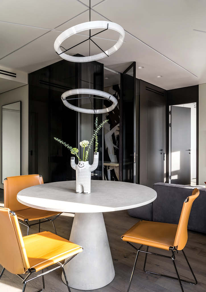 They placed an original coffee table which formed laconic circles with the backlit on the top one side by side with the grey deep sofa. This coffee table is resonating with the round pendant Vibia lamps that they set over the dining table.