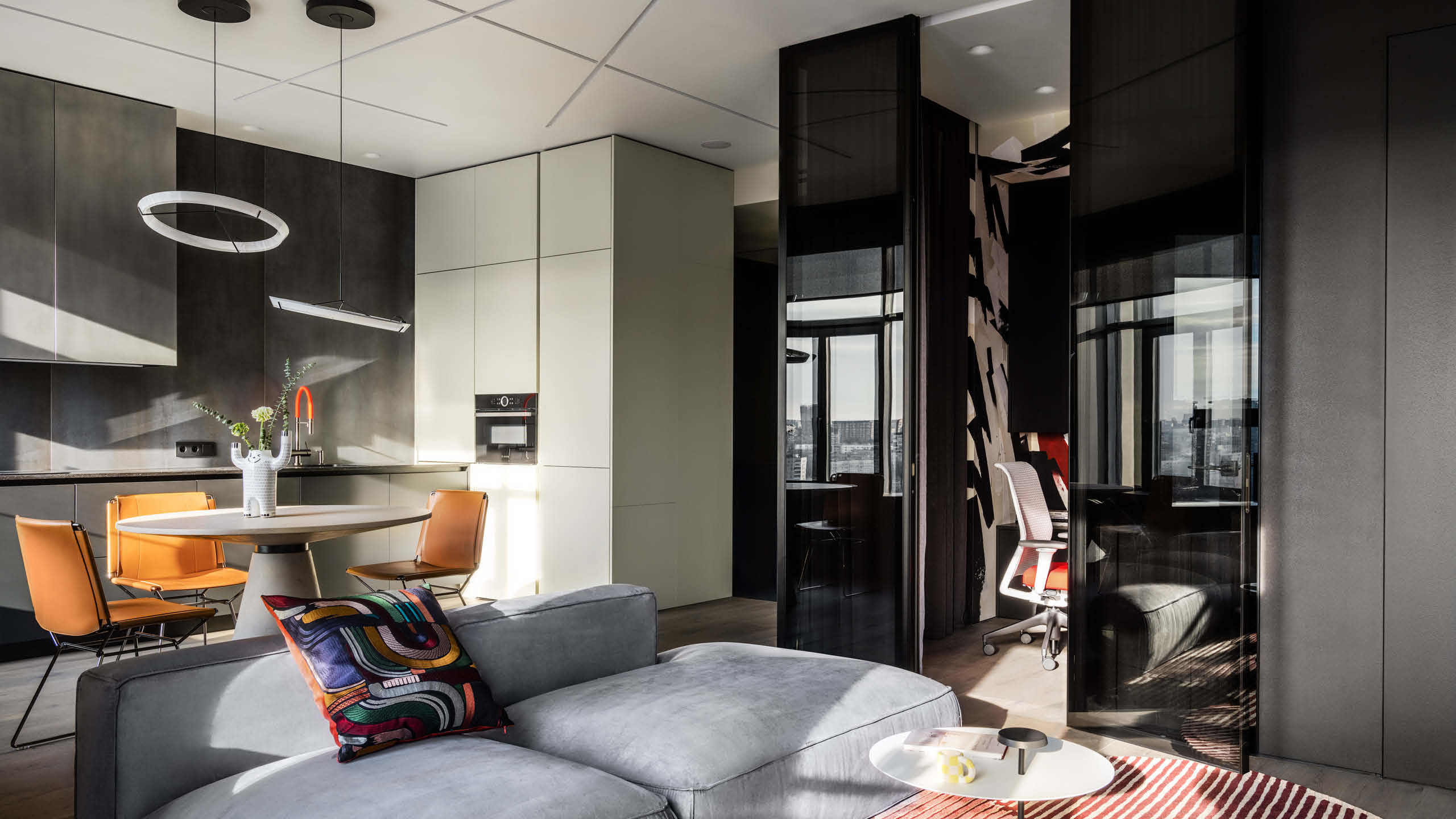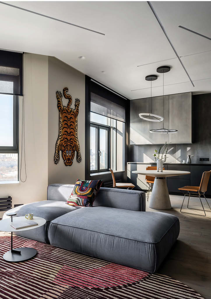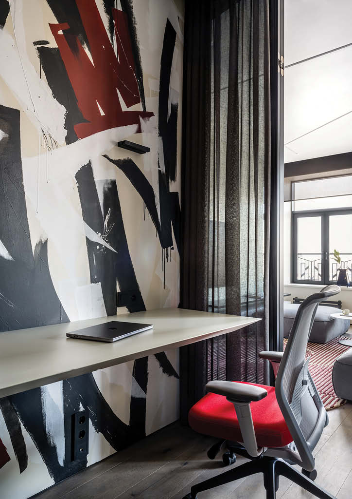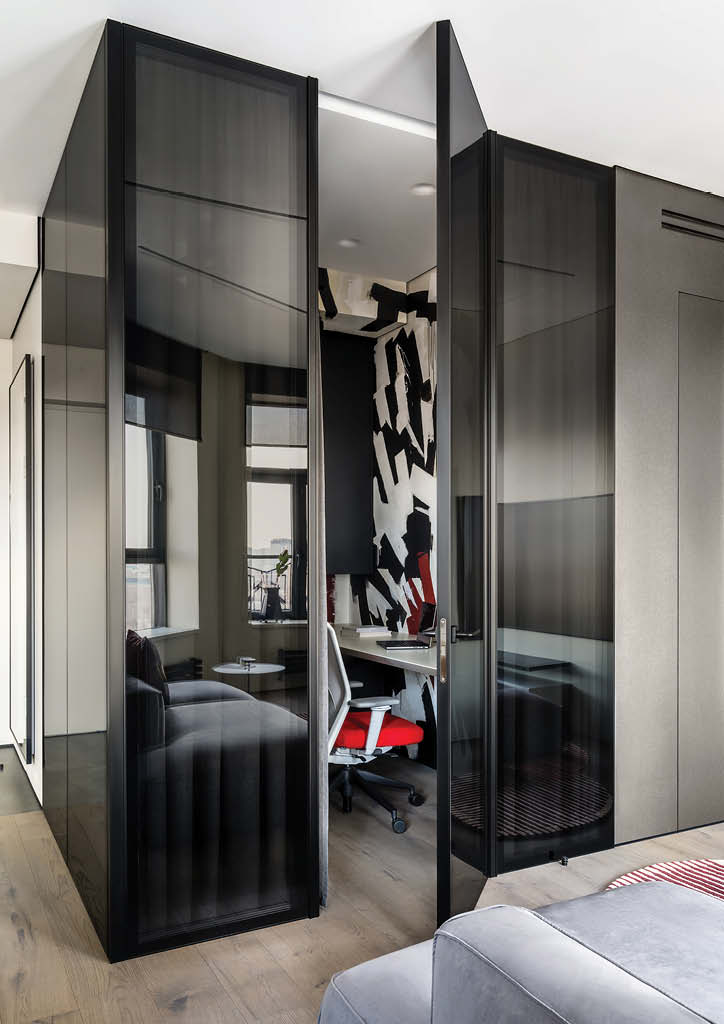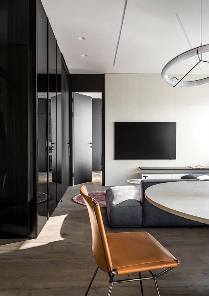 Understanding the users’ personality helps designers to create spaces that match the occupant’s wants and needs. Alexander Tischler was commissioned to design an interior of an apartment for a young man who is keen on modern culture and music. The studio explains that it was important to create a personalized interior for a homeowner where the art objects would perfectly fit in. Since the client plans to shoot videos for his YouTube channel, finding a place for a home office was also an important part of the design process.